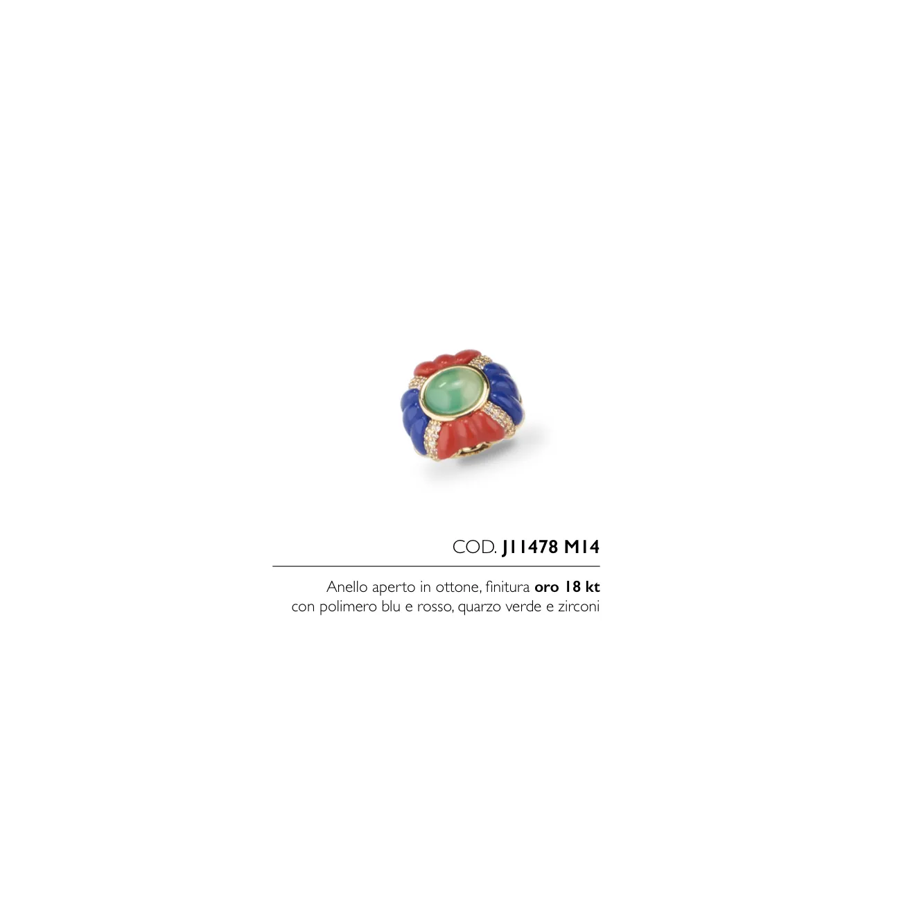 Anello aperto in ottone con finitura oro 18 kt, con polimero blu e rosso, quarzo verde e zirconi, un gioiello contemporaneo dal carattere deciso che gioca con contrasti cromatici e punti luce per un effetto subito scenografico. Il blu e il rosso portano energia e personalità, il quarzo verde aggiunge profondità e un tocco più naturale, mentre gli zirconi illuminano l’insieme con brillanti accenti raffinati, rendendolo perfetto per dare ritmo anche al look più essenziale e per chi ama distinguersi con eleganza. Il gioiello presenta una taglia 14