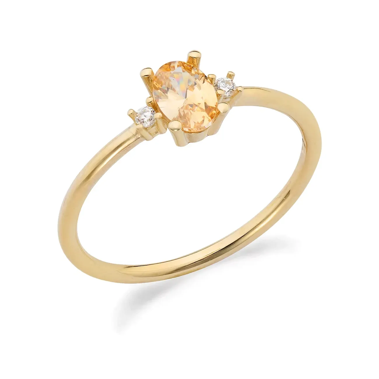 Anello in oro giallo 375 con Zirconi bianchi e giallo. Larghezza centrale 6,00 mm, lunghezza centrale 4,00 mm, lunghezza zirconi laterali 7,73 mm, spessore 3,30 mm, misura anello 13. La referenza è KAAZ 026