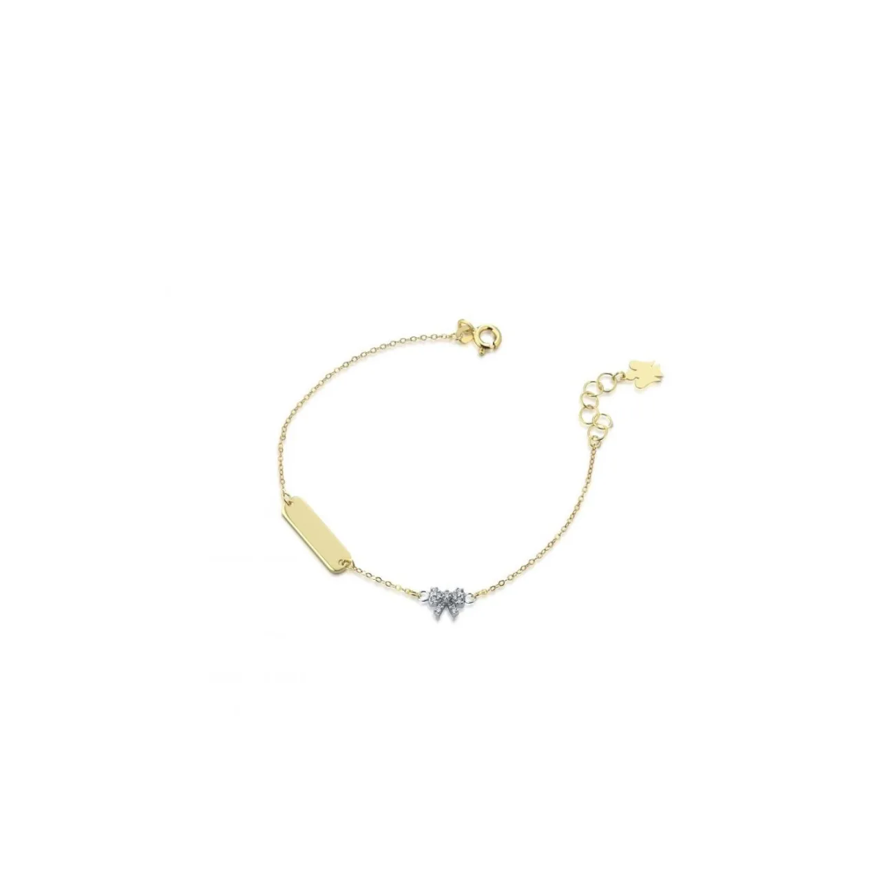Bracciale con targhetta e angelo charm in oro giallo, fiocco in oro bianco con zirconi bianchi, possibilità di incisione, lunghezza bracciale 14/16,5 cm, lunghezza targhetta 1,6 cm angelo: base 0,60 cm - altezza 0,75cm , fiocco: base 0,6 cm - altezza 0,55 cm, il codice è nkt340