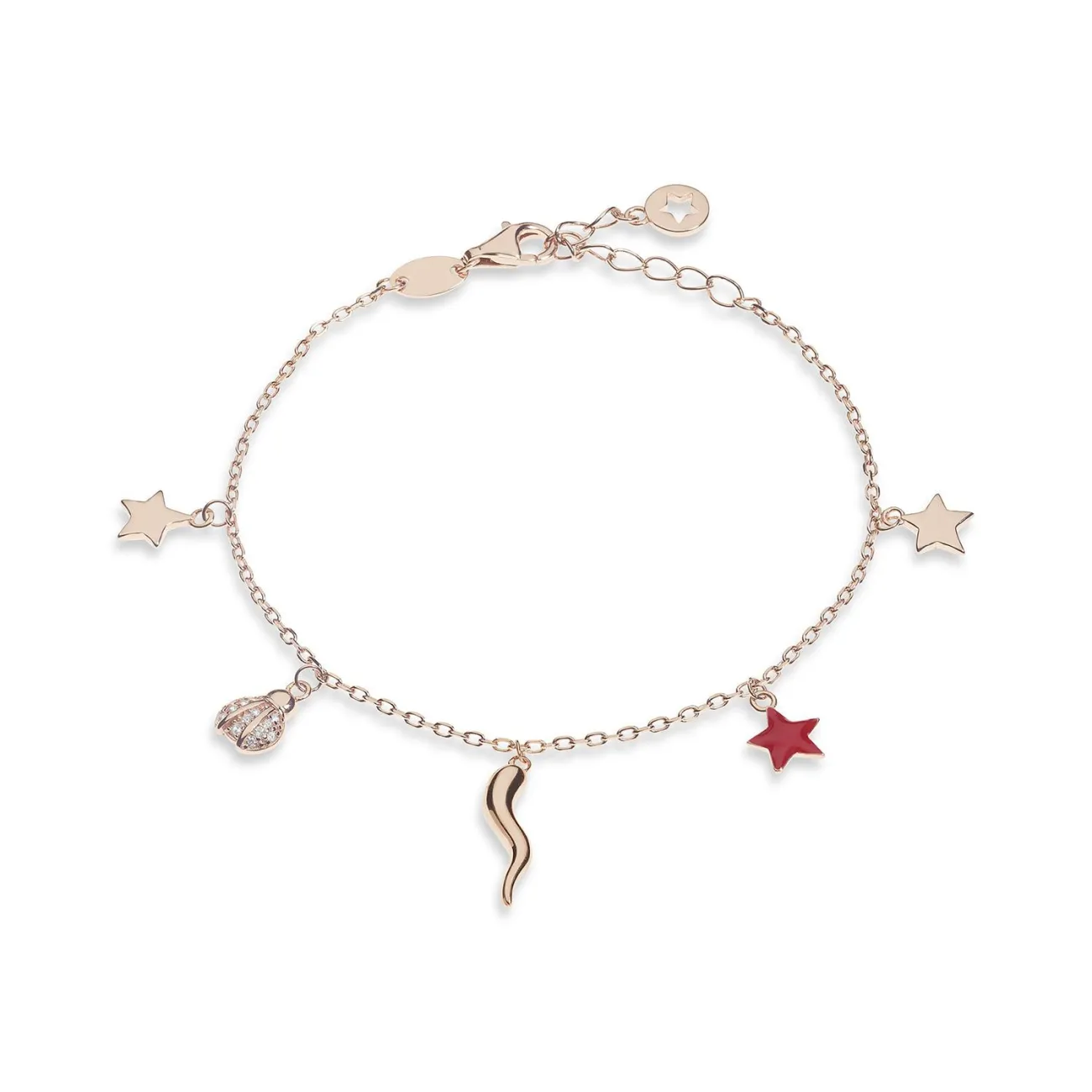 Bracciale da donna di Comete della collezione Talismano. Bracciale in Argento 925 con trattamento di doratura rosè e smalto rosso, zirconi bianchi. Dimensioni: lunghezza bracciale cm 16 + 3 cm, larghezza pendente c.le 2,80 mm, lunghezza pendente c.le 15,46 mm, spessore pendente c.le 2,80 mm, misura stelline e coccinella inscritte in un cerchio di diametro 6,20 mm. La referenza è BRA 244.