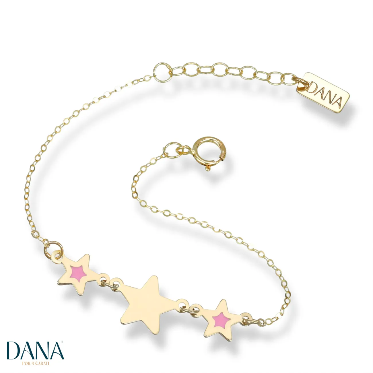 Un gioiello delicato e raffinato, il bracciale Baby incanta con il suo design romantico e giocoso. Realizzato in oro giallo lucido, è impreziosito da piccole stelle in smalto rosa che aggiungono un tocco di dolcezza e colore. La misura regolabile (13 + 2 cm) lo rende adatto a ogni polso, perfetto per donare un tocco di eleganza quotidiana o per un regalo speciale a una giovane donna. Ideale per occasioni informali o per completare un look femminile e sofisticato.