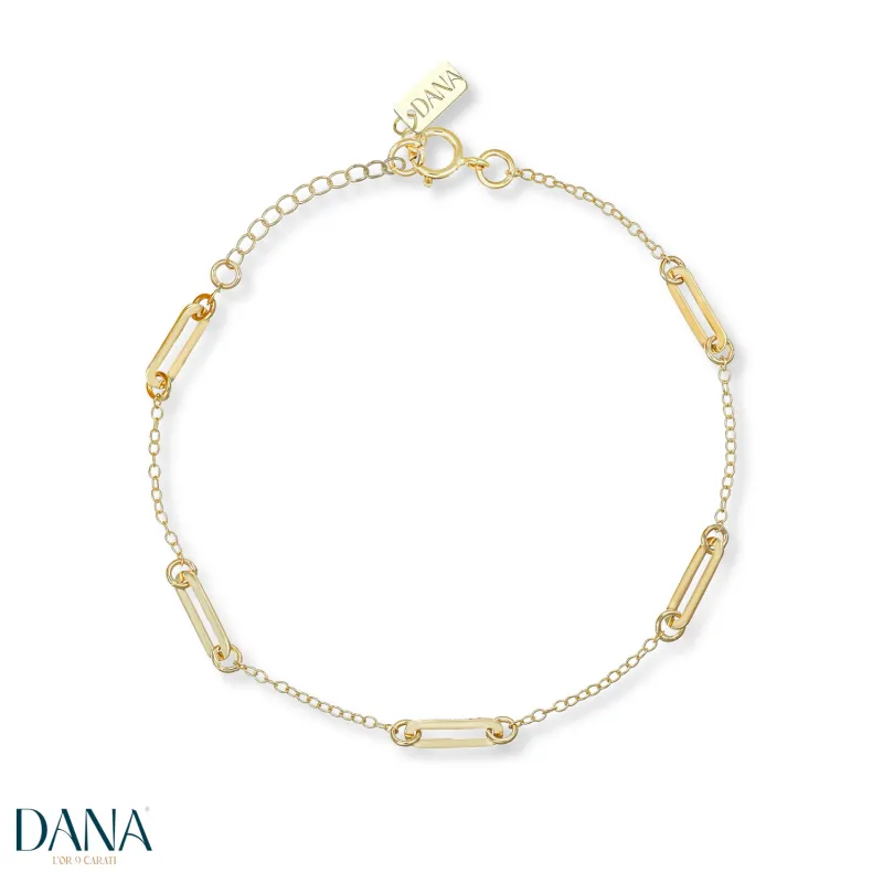Elegante e raffinato, questo bracciale da donna cattura l'attenzione con i suoi 5 elementi distanziati in oro giallo, che donano un equilibrio perfetto tra minimalismo e luminosità. La lunghezza regolabile da 16 a 19 cm lo rende adatto a qualsiasi polso, mentre la tonalità calda dell'oro giallo aggiunge un tocco di classe senza tempo. Ideale per occasioni speciali come cerimonie o serate romantiche, ma anche per arricchire un look quotidiano con un dettaglio prezioso. La sua struttura leggera e armoniosa lo rende comodo da indossare, regalando un'eleganza discreta ma irresistibile.