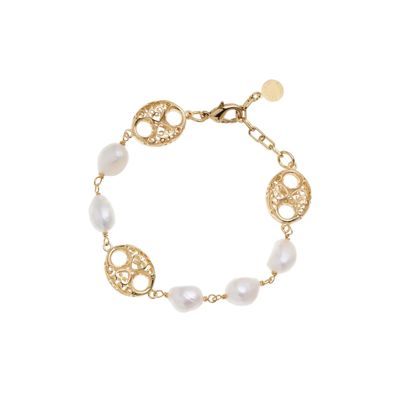 Bracciale del brand Ottaviani. Gioiello dorato con perle di lunghezza 19,5+ ext 3,5 larghezza 1,7. Chiusura Moschettone. La referenza è 501027B