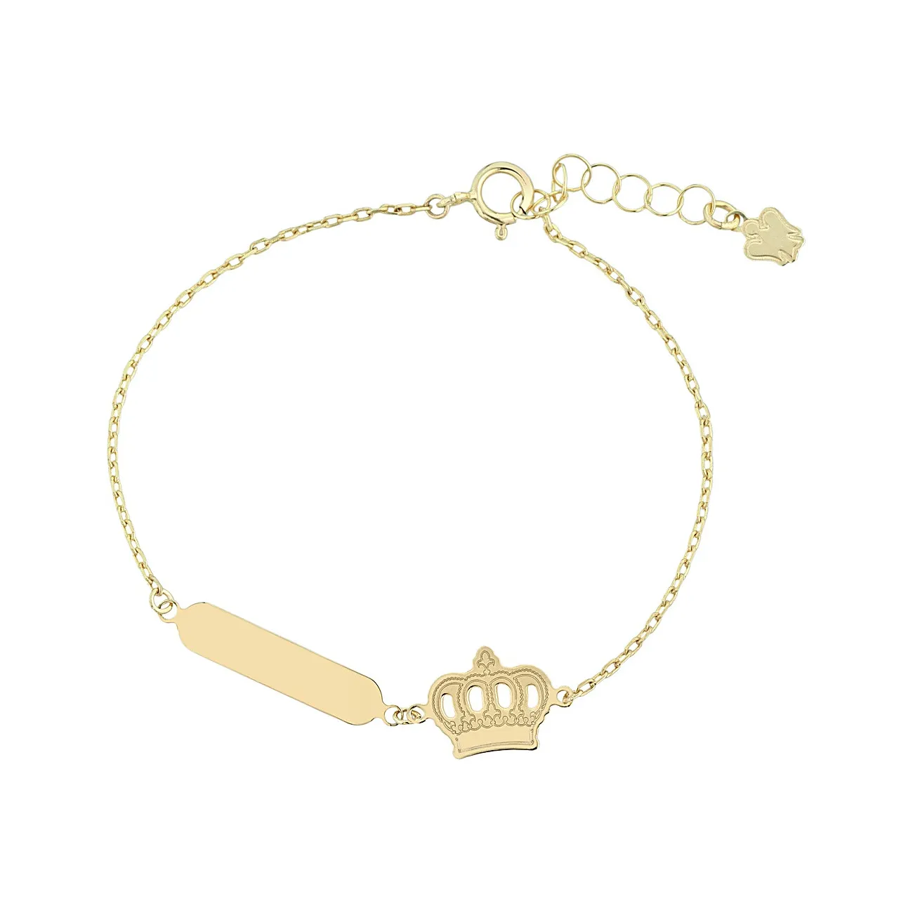 Bracciale bimbo/a in oro giallo con targhetta e simbolo corona, un gioiello prezioso pensato per celebrare i momenti più importanti con un dettaglio elegante e ricco di significato. Realizzato in oro 375 (9 kt), è ideale come regalo per nascita, battesimo, compleanno o ricorrenze speciali, grazie a un design delicato ma distintivo. La corona, dalle dimensioni base 0,9 cm e altezza 0,8 cm, aggiunge un tocco tenero e raffinato, perfetto per un gioiello dedicato ai più piccoli. La targhetta da 1,7 cm è pensata per rendere il bracciale unico: è possibile inserire un’incisione personalizzata (a discrezione del cliente) con nome, data o un breve messaggio, trasformandolo in un ricordo da custodire nel tempo. La lunghezza regolabile 14/16 cm assicura una vestibilità comoda e adattabile, seguendo la crescita. Un bracciale in oro dal valore affettivo importante, elegante nella semplicità e perfetto per creare un regalo personalizzato, prezioso e indimenticabile.