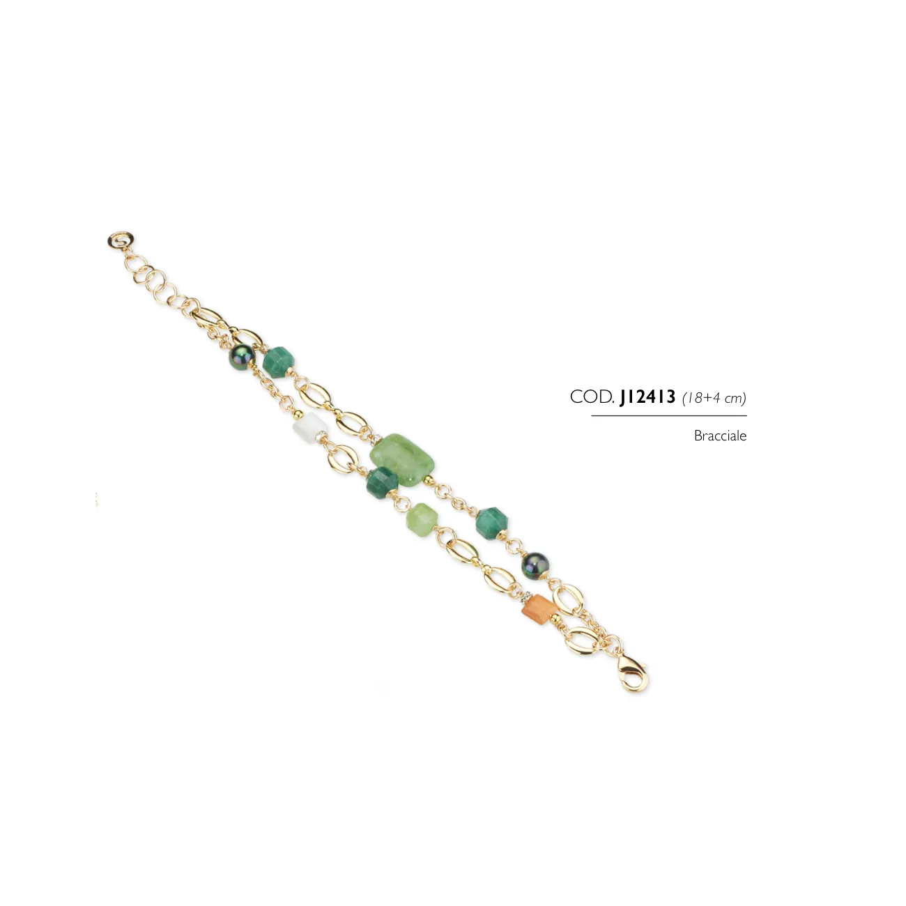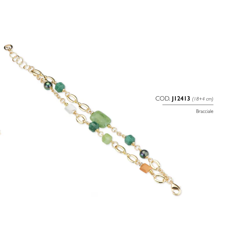 Il bracciale J12413, con lunghezza 19 cm + 3 cm di estensione e chiusura a moschettone, è un accessorio elegante e contemporaneo, perfetto per aggiungere al look un tocco di colore naturale e sofisticato. Le pietre dure verdi donano profondità e carattere, creando un punto luce raffinato che valorizza il polso con discrezione e stile. Un gioiello pensato per chi ama dettagli ricercati e tonalità ispirate alla natura. Ideale da indossare sia di giorno sia di sera, si abbina facilmente a outfit neutri (bianco, nero, beige) e sta benissimo anche con denim e palette calde o naturali, diventando protagonista con un semplice gesto. Grazie alla catenina di estensione, la vestibilità è comoda e regolabile, perfetta da portare da solo per un effetto minimal oppure insieme ad altri bracciali per un look più personale. Il bracciale J12413 è anche una splendida idea regalo per chi ama gioielli versatili e luminosi, capaci di unire praticità e stile in un accessorio sempre attuale.