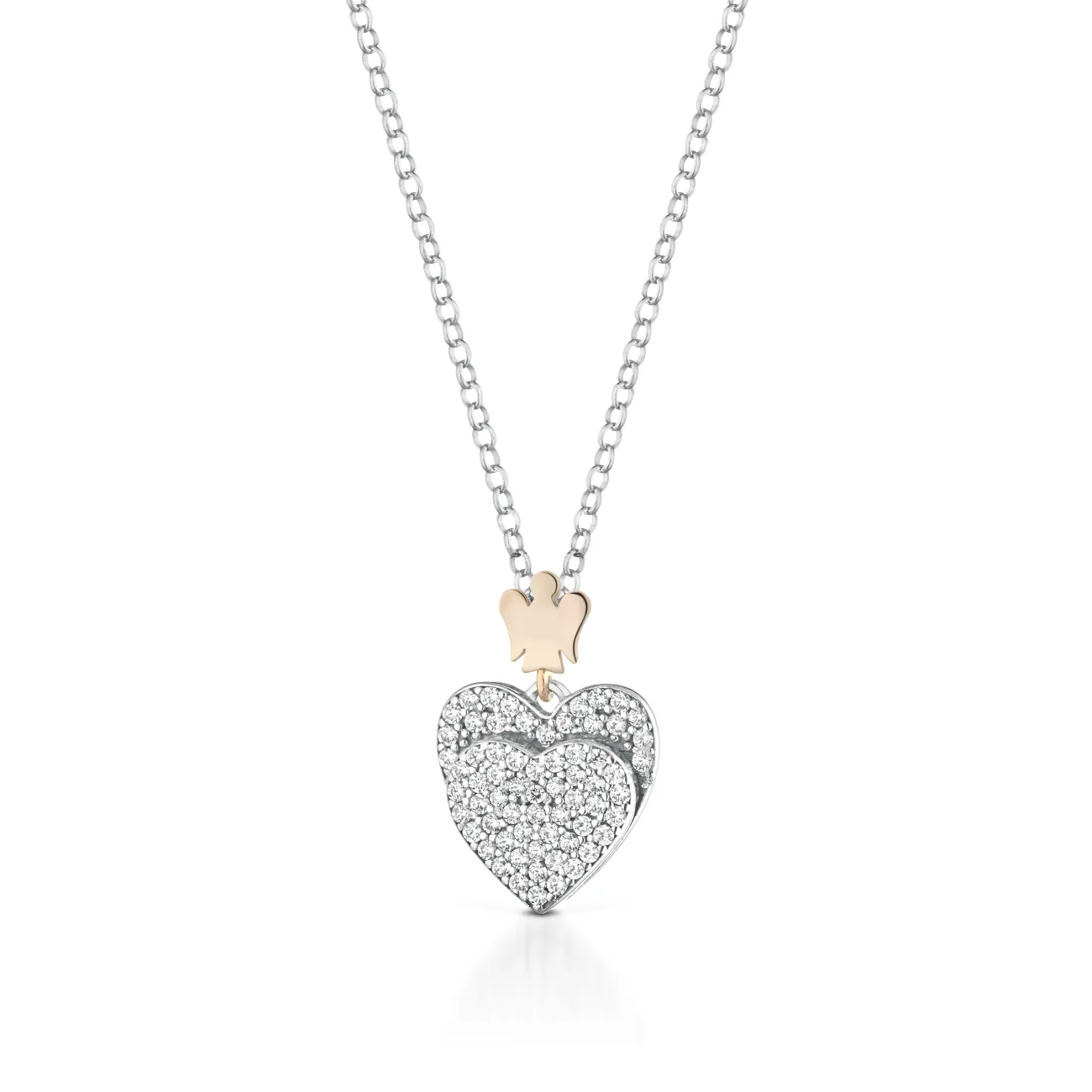 Collana con pendente doppio cuore in argento, zirconi bianchi e Angelo in argento rosato. Lunghezza 40/45 cm, cuore 1,2 cm , angelo 0,5 cm