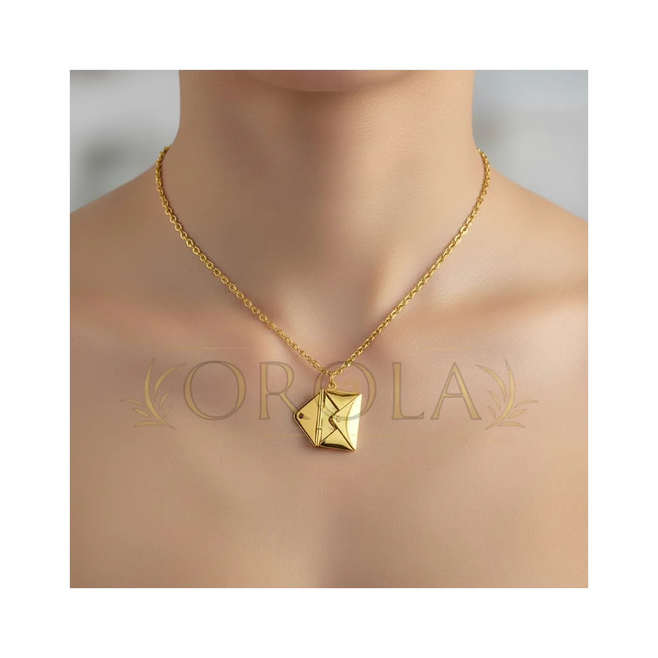 Collana “Lettera d’Amore”: ciondolo a busta apribile con mini-lettera interna e messaggio nascosto; acciaio inossidabile; finiture disponibili colore argento o tono oro; incisione personalizzabile (nomi, date, breve dedica); idea regalo romantica per coppie e famiglia, perfetta per anniversari, San Valentino e compleanni; design minimal ed elegante adatto all’uso quotidiano; manutenzione semplice: pulire con panno morbido ed evitare contatto con profumi/creme.