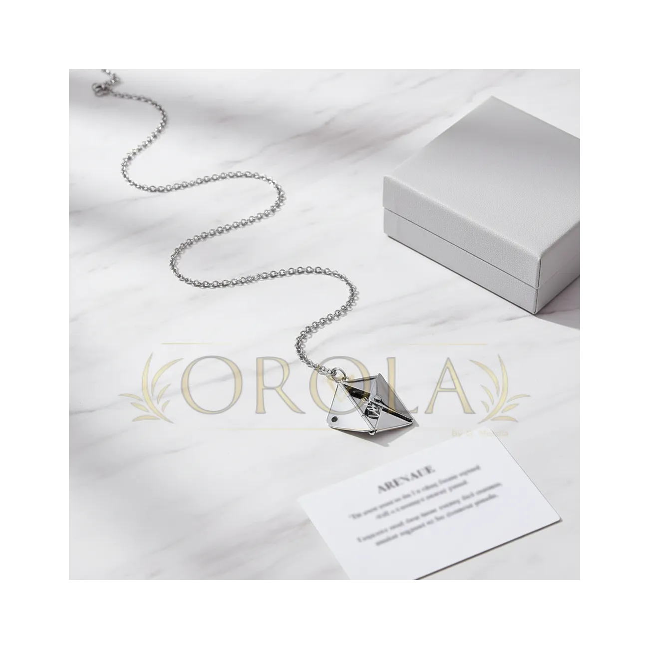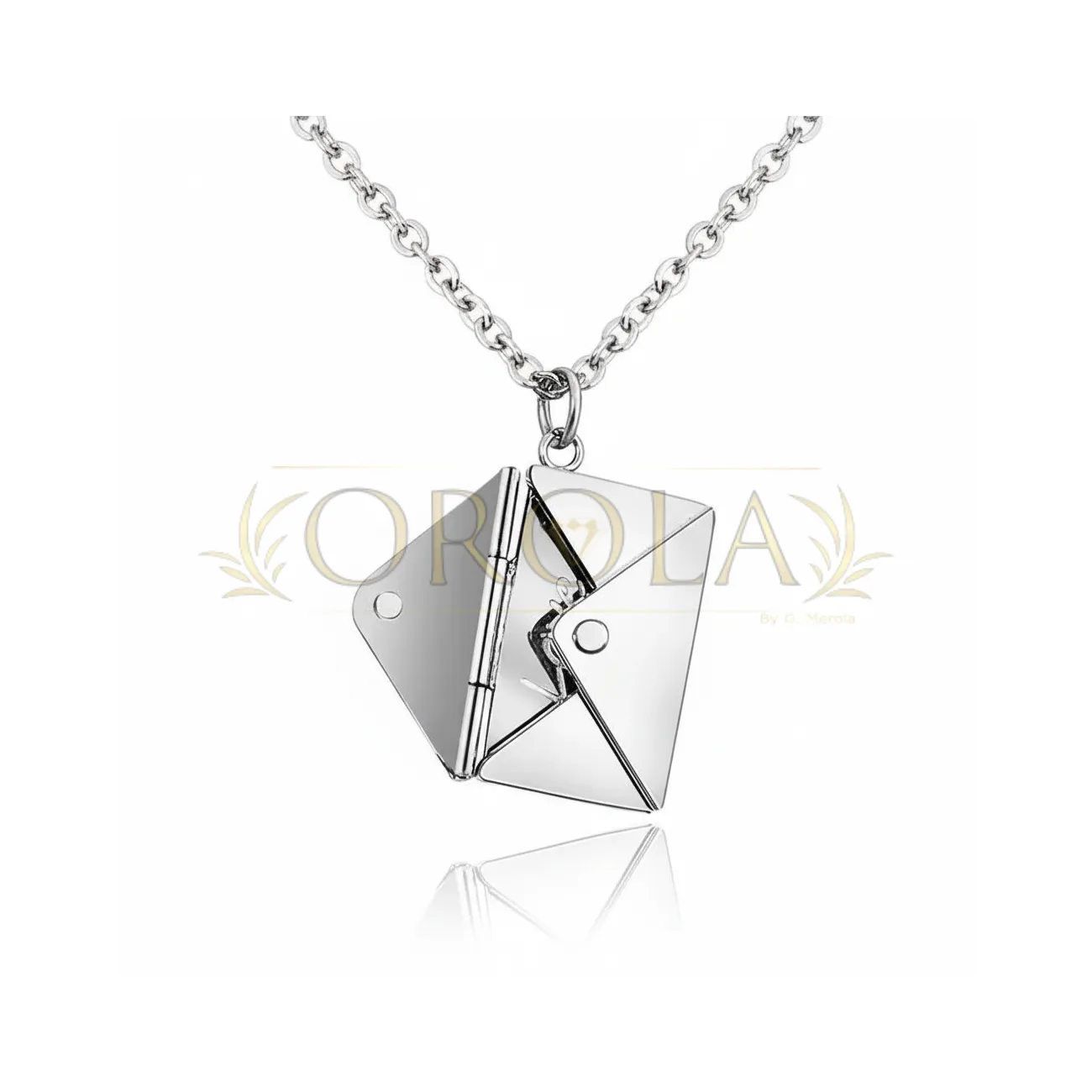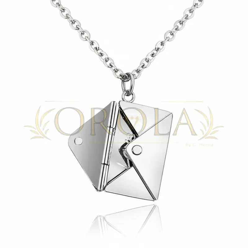 Collana “Lettera d’Amore”: ciondolo a busta apribile con mini-lettera interna e messaggio nascosto; acciaio inossidabile; finiture disponibili colore argento o tono oro; incisione personalizzabile (nomi, date, breve dedica); idea regalo romantica per coppie e famiglia, perfetta per anniversari, San Valentino e compleanni; design minimal ed elegante adatto all’uso quotidiano; manutenzione semplice: pulire con panno morbido ed evitare contatto con profumi/creme.
