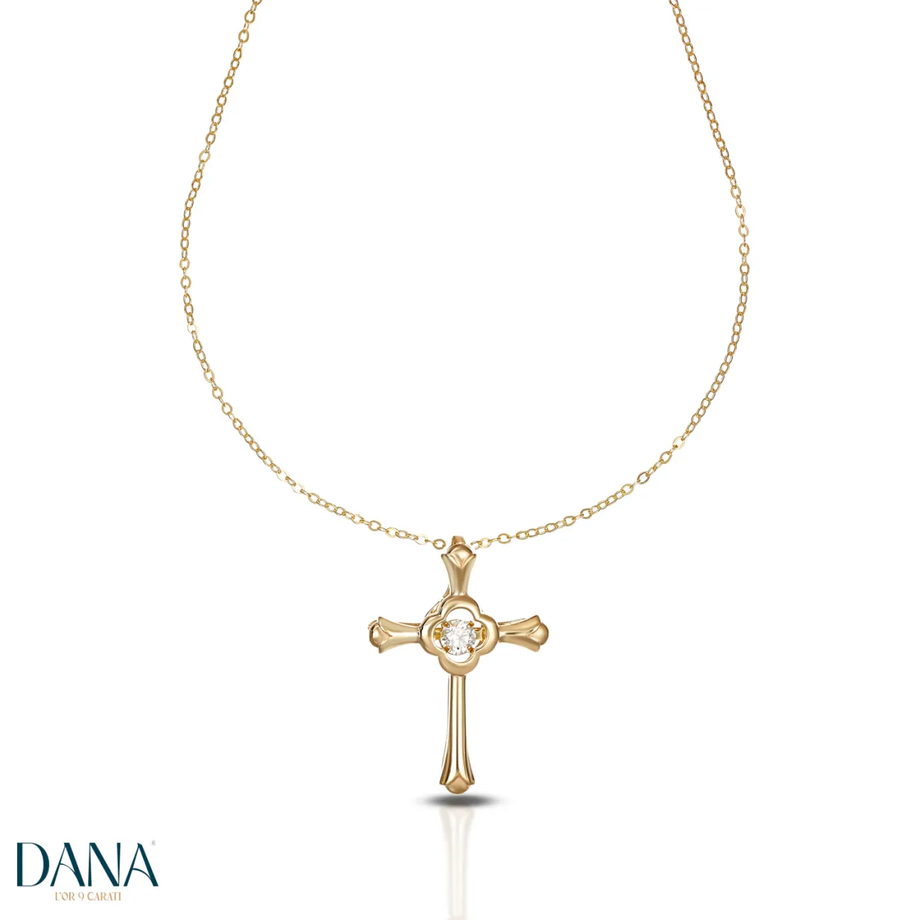 Collane con croce dal design stilizzato e moderno, impreziosite da una pietra bianca danzante che cattura ogni movimento e riflette bagliori infiniti; realizzate in Oro 9 Carati (Giallo o Bianco) per accompagnare ogni donna con grazia ed eleganza ed esaltarne la luminosità naturale; lunghezza 42+3 cm, regolabile per ogni occasione; un classico che si rinnova per brillare per sempre.