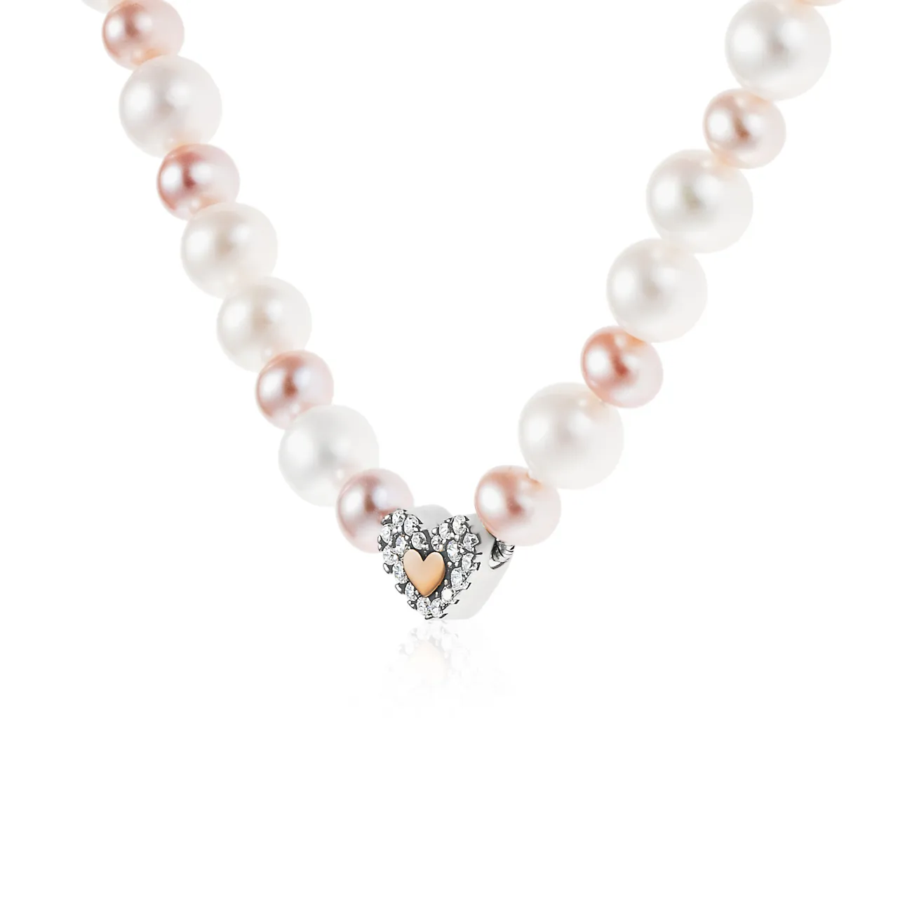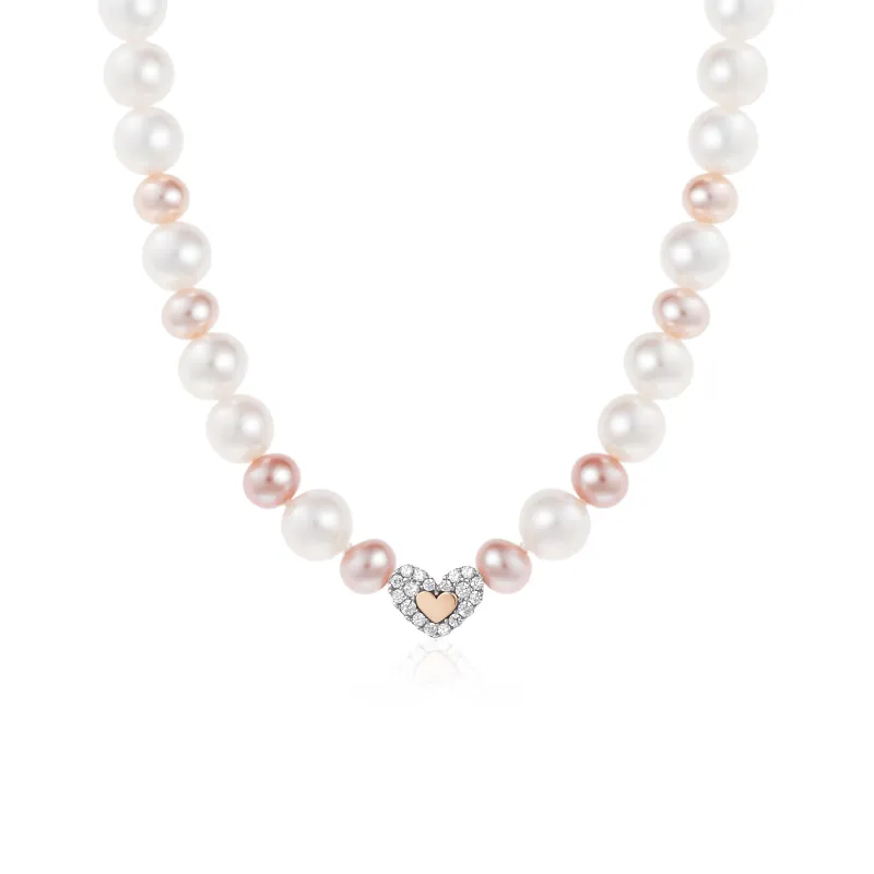 Collana di perle bianche e rosa con doppio cuore, uno pavé di zirconi bianchi e uno in argento rosato, pensata per un’eleganza romantica che unisce brillantezza e calore. La lunghezza regolabile 40/43 cm si posa sul punto clavicola, valorizzando scollature e permettendo abbinamenti in layering con collane più sottili. Le perle rosa (diametro 4/4,5 cm) alternano un ritmo cromatico delicato alle perle bianche, esaltando i riflessi del metallo rosato e la lucentezza delle pietre. Il ciondolo a cuore (base 0,8 cm, altezza 0,6 cm) offre un punto luce discreto ma evidente, perfetto per completare outfit quotidiani e mise eleganti. La finitura lucida e i dettagli curati rendono il gioiello facile da coordinare con orecchini e bracciali in argento rosato o con elementi pavé, per un look femminile e sempre attuale. Ideale come idea regalo dal forte valore affettivo, aggiunge personalità e luminosità a camicie, abiti e maglieria.