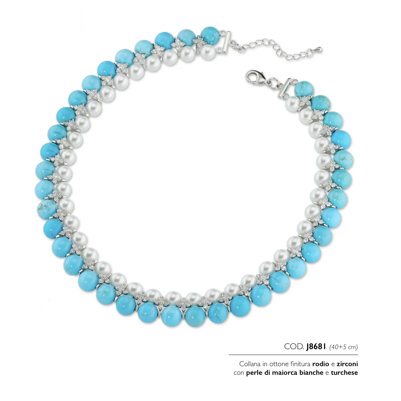 La collana in ottone con finitura rodio, zirconi e perle di Maiorca bianche e turchese è un accessorio elegante e contemporaneo, perfetto per aggiungere al look un punto luce fresco e sofisticato. La finitura rodio dona un effetto luminoso e moderno, mentre gli zirconi impreziosiscono il design con riflessi brillanti e delicati. Le perle di Maiorca, nella combinazione bianco e turchese, completano l’insieme con un contrasto raffinato che richiama tonalità marine e dettagli ricercati. Ideale da indossare sia di giorno sia di sera, questa collana si abbina facilmente a outfit neutri (bianco, nero, grigio, beige) e valorizza anche denim e look estivi in lino o cotone, illuminando il décolleté con eleganza. Il turchese aggiunge una nota di colore vivace ma chic, mentre il bianco mantiene l’insieme equilibrato e adatto anche a occasioni speciali e cerimonie. Un gioiello versatile e luminoso.
