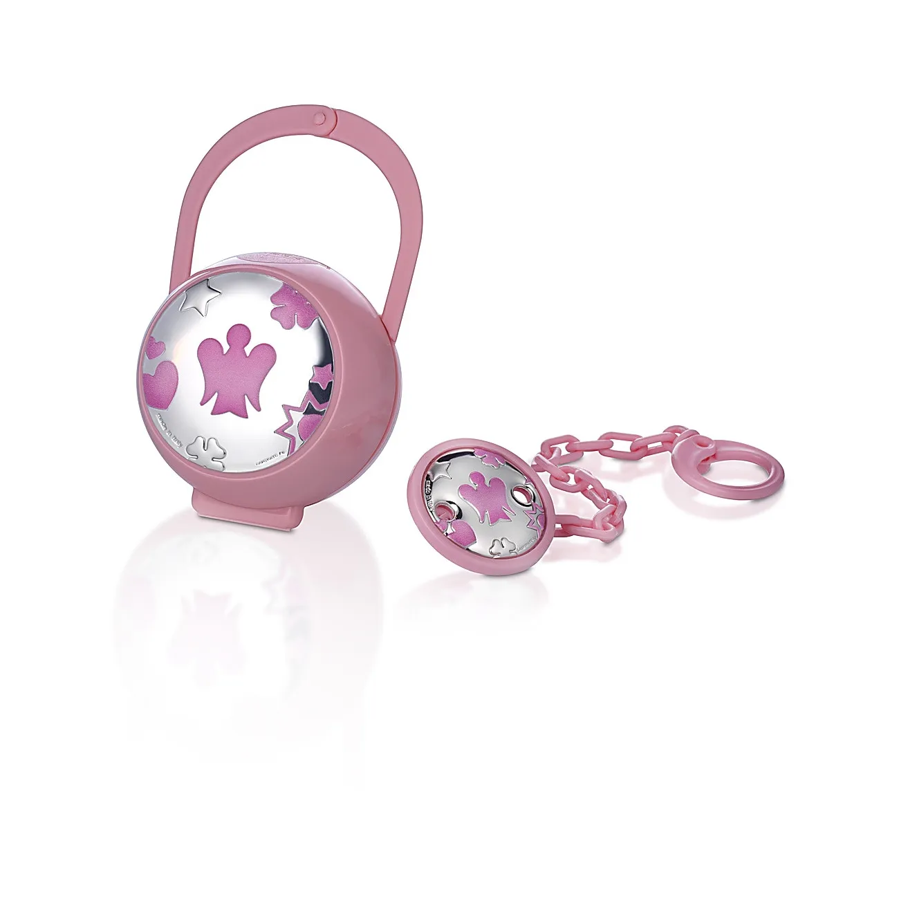 Il set pinza e porta ciuccio è l'accessorio perfetto come regalo ad una neo mamma. Con il suo design delicato ed elegante simboleggia un legame molto forte e indissolubile col nuovo arrivato. E' caratterizzato da dettagli ricchi di sentimento e significato. L'angelo, sinonimo di protezione per il piccolo che indosserà il porta ciuccio ma anche il cuore, il sole e la luna.
