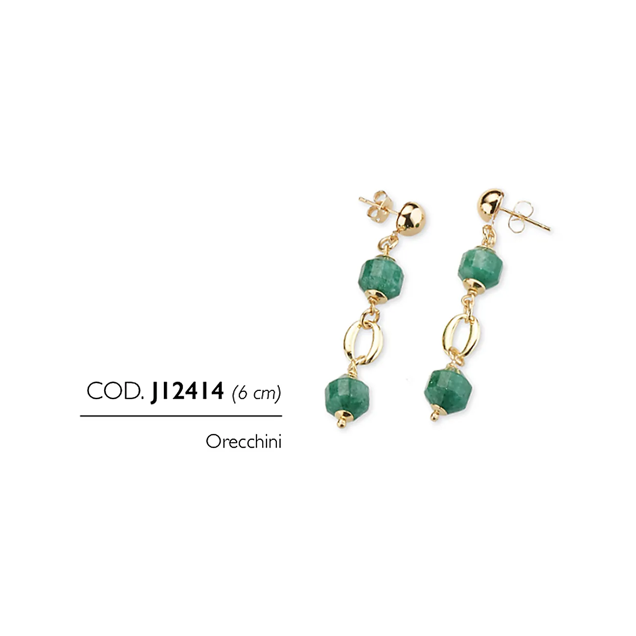 Gli orecchini J12414 in ottone con finitura oro e cristalli verdi sono la scelta ideale per chi vuole aggiungere al look un tocco di colore elegante e contemporaneo. I cristalli verdi catturano la luce con riflessi intensi e sofisticati, donando profondità e carattere, mentre la finitura dorata valorizza l’insieme con un effetto prezioso e luminoso. Un accessorio pensato per farsi notare con classe, senza risultare eccessivo.  Perfetti da indossare sia di giorno che di sera, questi orecchini si abbinano facilmente a tonalità neutre come bianco, nero, beige e denim, ma risultano impeccabili anche con look più ricercati per eventi e occasioni speciali. Il verde, raffinato e versatile, dona un’allure chic e si presta a outfit stagionali, soprattutto in primavera ed estate. Gli orecchini J12414 sono anche un’ottima idea regalo per chi ama gioielli luminosi e moderni, capaci di unire finitura oro e dettagli colorati in modo equilibrato e di grande effetto.
