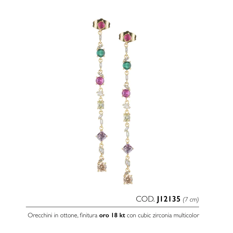 Gli orecchini in ottone con finitura oro 18 kt e cubic zirconia multicolor sono un accessorio elegante e contemporaneo, perfetto per aggiungere al look un punto luce vivace e sofisticato. La finitura oro 18 kt dona calore e un effetto prezioso, mentre le pietre multicolor catturano la luce con riflessi brillanti e sfumature diverse, creando un equilibrio raffinato tra colore e luminosità. Un gioiello pensato per chi ama distinguersi con dettagli ricercati, senza rinunciare alla versatilità. Ideali da indossare sia di giorno sia di sera, questi orecchini si abbinano facilmente a outfit neutri (bianco, nero, beige) e diventano protagonisti anche su denim e look minimal, dando carattere con un solo gesto. Il multicolor li rende perfetti per giocare con abbinamenti tono su tono o a contrasto, e per aggiungere una nota allegra ma elegante anche in occasioni speciali.