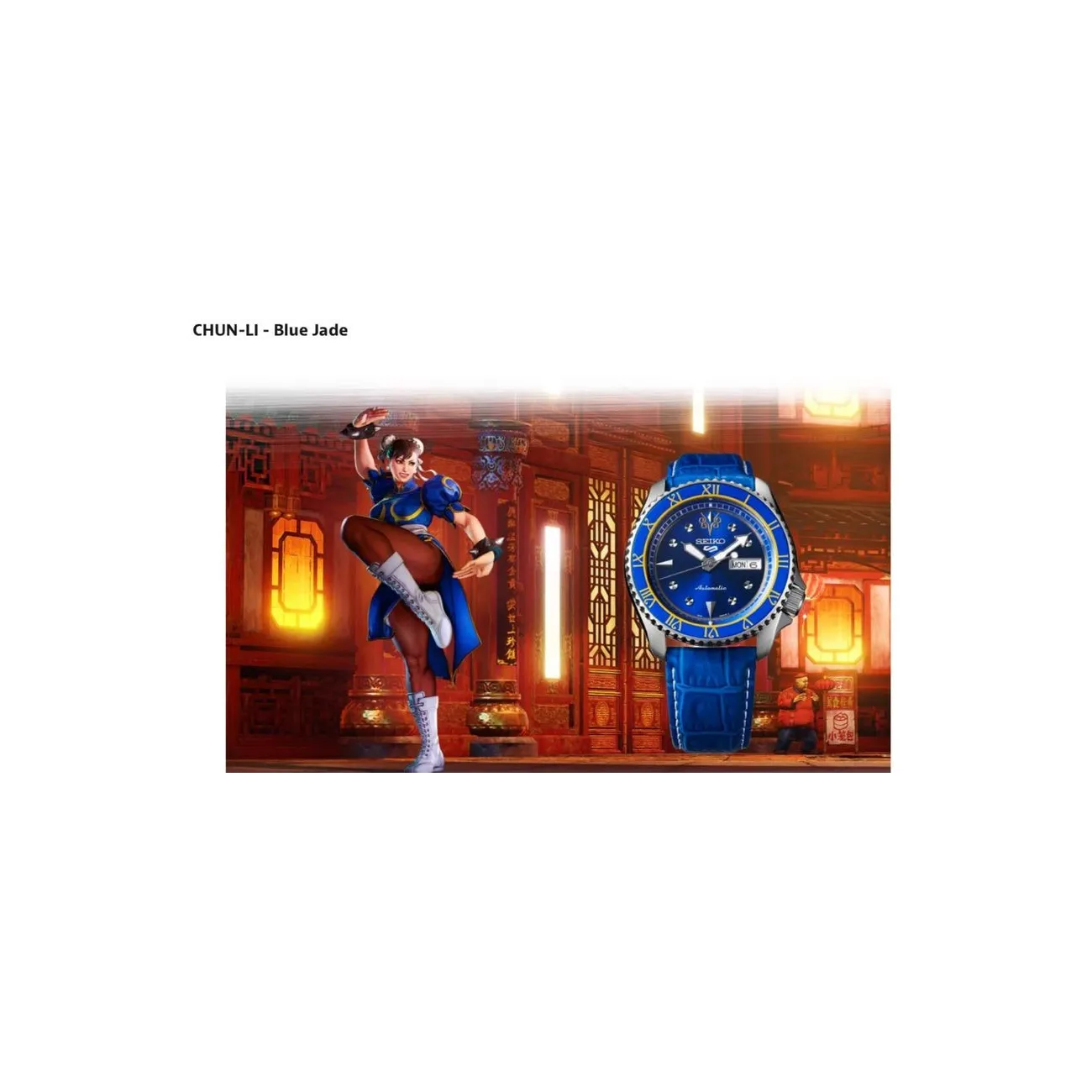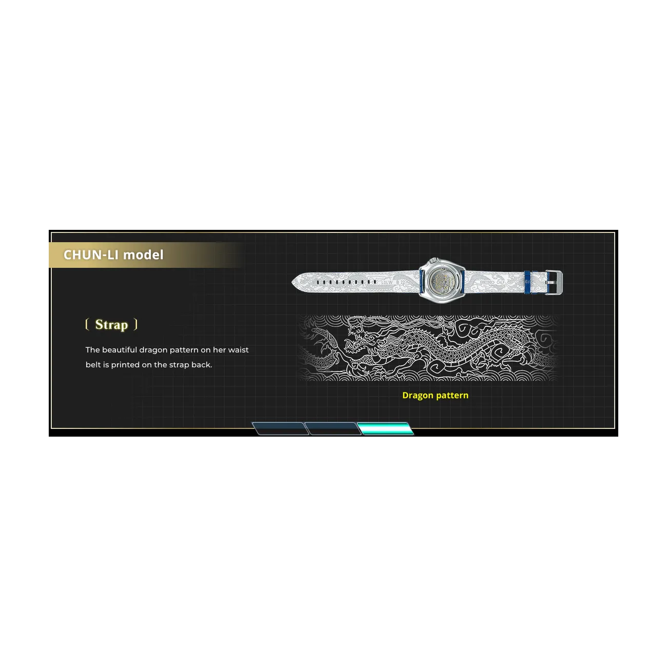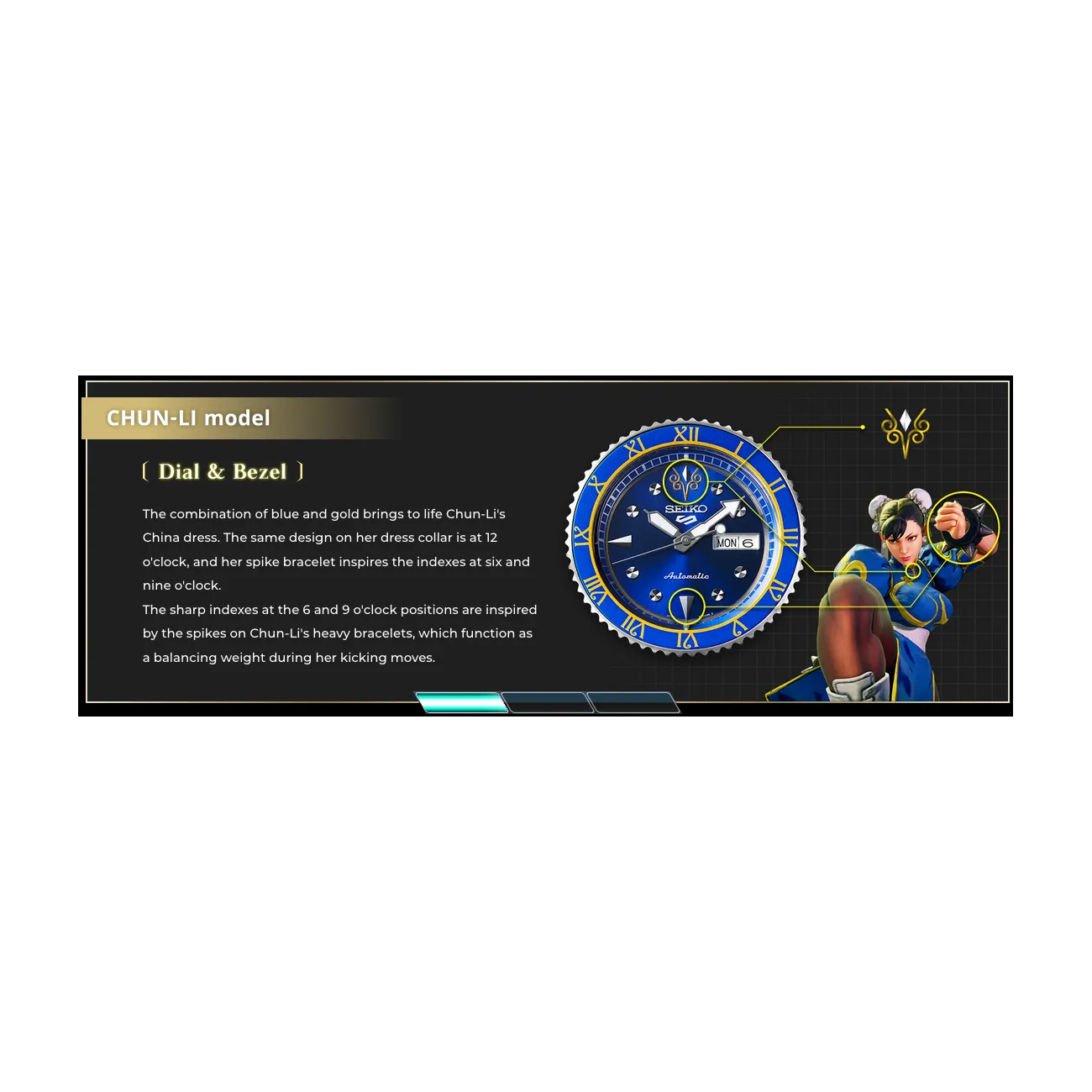 Profumo d’Oriente per la versione blu-oro che omaggia l’uniforme della bellissima guerriera Chun Li. A ore 6 e a ore 9, le borchie ispirate ai suoi bracciali, mentre a ore 12 viene riproposto il medesimo disegno sul colletto dell’abito. Dietro al cinturino, invece, il motivo a forma di drago che Chun Li indossa sulla cintura.