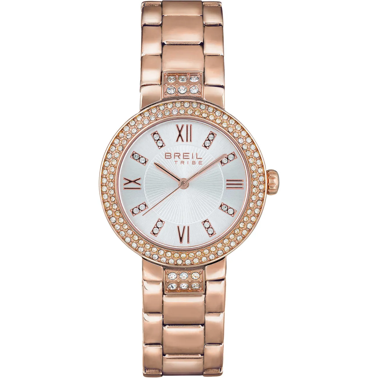 Orologio Solo Tempo Da Donna Di Breil Tribe Della Collezione Dancefloor. Orologio Con Movimento Al Quarzo Miyota 2035. W.R. 5 Atm. Orologio Con Cassa In Acciaio Ip Rose Lucido. Lunetta Ip Rose Con Cristalli. Il Quandrante È Di Colore Silver Con Effetto Sunray E Cristalli. Sfere Ip Rose. Il Vetro Del Quadrante È Realizzato Con Vetro Minerale. Bracciale In Acciaio. Chiusura Con Pulsanti. Il Diametro Della Cassa È Di 32 Mm. La Resistenza All'Acqua È Di 5 Atm. La Referenza È Ew0505