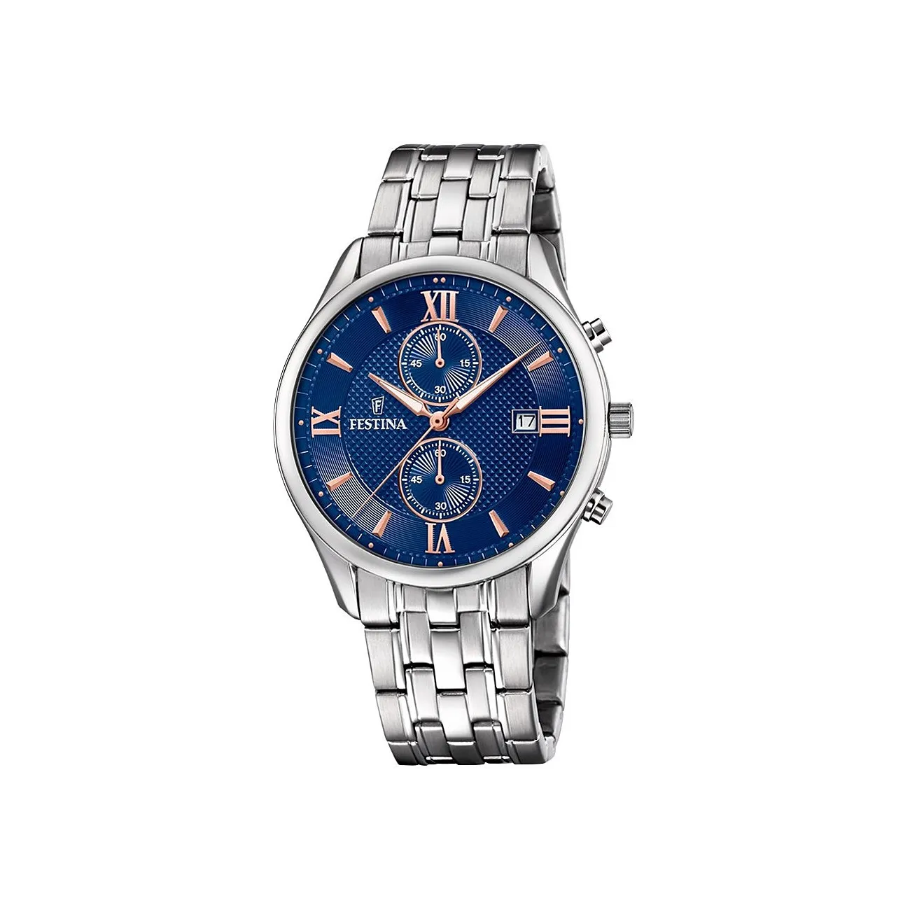 Orologio Cronografo Da Uomo Di Festina Della Collezione Timeless Chronograph. Cassa In Acciaio Inossidabile 316L Del Diametro Di Mm 42 E Cinturino In Acciaio Inossidabile 316L. Colore Quadrante: Azzuro. Orologio Cronografo Con Movimento M0S11. Resistenza All'Acqua: 10 Atm / 100 M. La Referenza È F6854/6