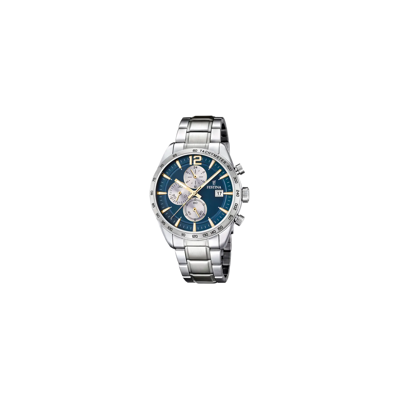 Orologio cronografo da uomo di Festina della collezione Timeless Chronograph. Modello con cassa in acciaio inossidabile 316l del diametro di mm 43,5, quadrante di colore blu petrolio e cinturino in acciaio inossidabile 316l. Orologio con movimento MJS15 e resistenza all'acqua di 5 ATM. La referenza è F16759/7