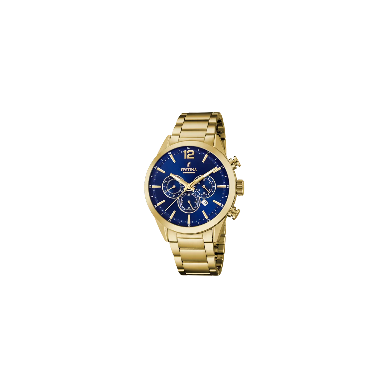 Orologio cronografo Festina, della collezione Timeless chronograph, con vetro in minerale, sfera di colore azzurro, indice placcato, Bracciale in acciaio con chiusura SO, cassa rotonda di dimensioni 43.5, resistenza all'acqua 5 ATM, movimento M0S20-45H102. La referenza è F20633/2