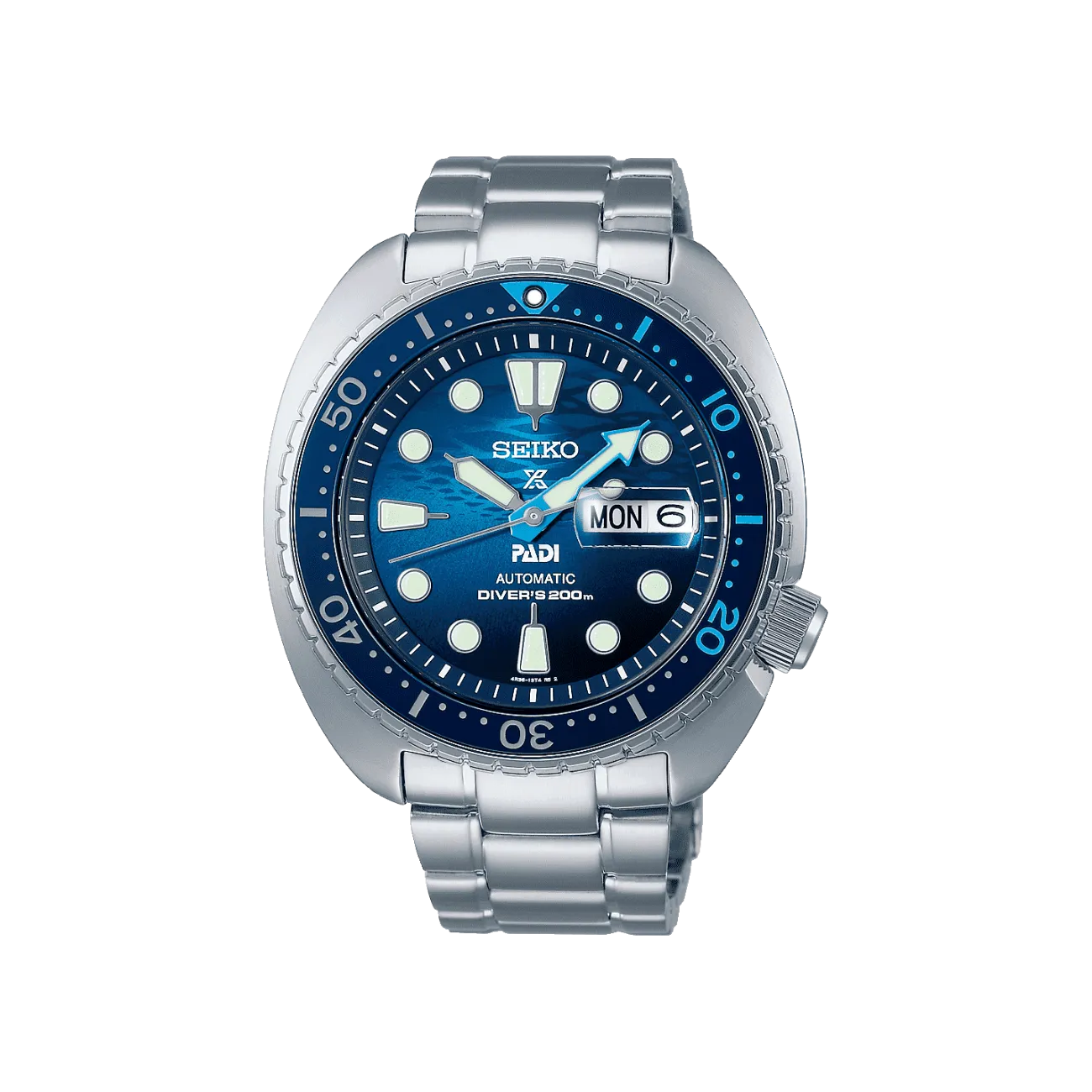 L'orologio subacqueo professionale SRPK01K1 PADI Special Edition "THE GREAT BLUE" è dotato del calibro 4R36, che offre una riserva di carica di circa 41 ore. Questo modello è composto dall'iconica cassa King Turtle e bracciale in acciaio inossidabile con rivestimento antigraffio che gli conferisce un'eccellente robustezza, nonché da una lunetta girevole unidirezionale. È impermeabile fino a 200 metri. Il motivo del bellissimo quadrante riflette la superficie dell'Oceano vista da sotto l'acqua, con la luce del sole che scende e la superficie dell'acqua in movimento.
