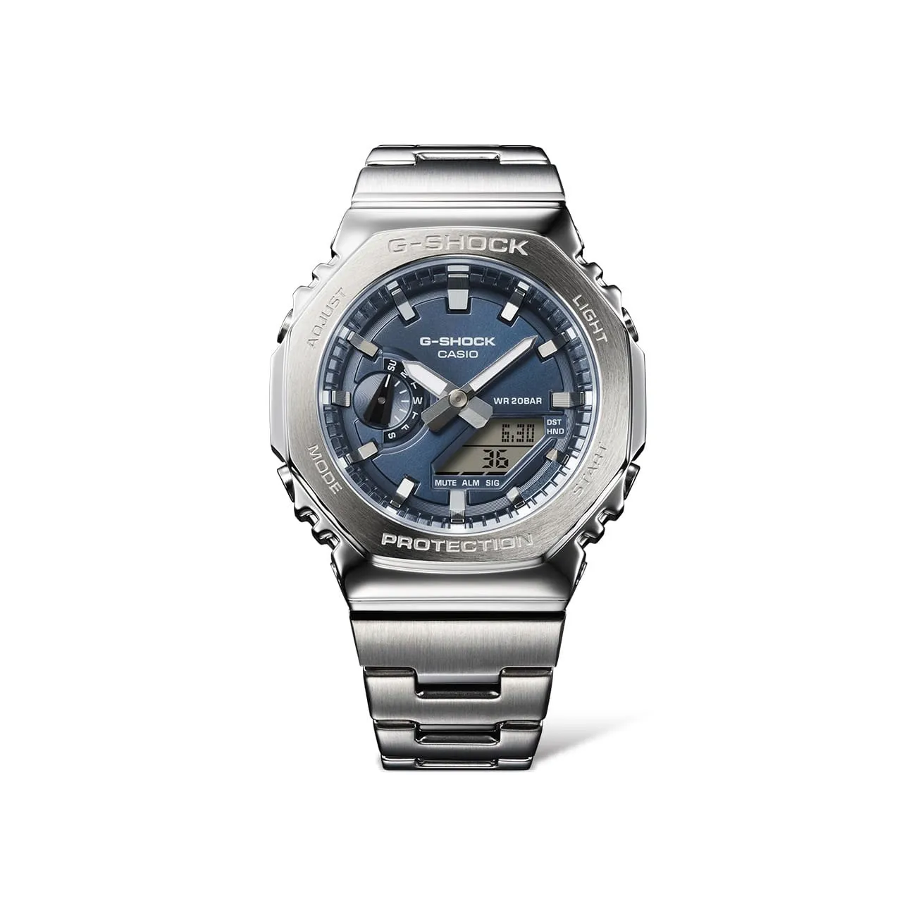 Il G-SHOCK GM-2110D combina il design classico e robusto dei modelli G-SHOCK con un tocco di eleganza grazie alla cassa in acciaio inossidabile e al nuovo bracciale in metallo. Con una cassa sottile di soli 11,8 mm, è uno dei modelli combinati più leggeri e resistenti, ideale sia per le attività quotidiane che per le situazioni più impegnative. Caratteristiche principali: Dimensioni della cassa: 49.3 × 44.4 × 11.8 mm Peso: 146 g Materiale della cassa e della lunetta: Resina rinforzata con fibra di vetro e acciaio inossidabile Cinturino: Cinturino in acciaio inossidabile con chiusura one-touch a 3 pieghe Struttura: Resistente agli urti Impermeabilità: Fino a 20 bar Alimentazione e durata della batteria: Durata approssimativa della batteria di 3 anni con SR726W X 2 Esterno: Vetro minerale Cinturino regolabile: Da 150 a 205 mm Neobrite: Luminescenza sui numeri e lancette