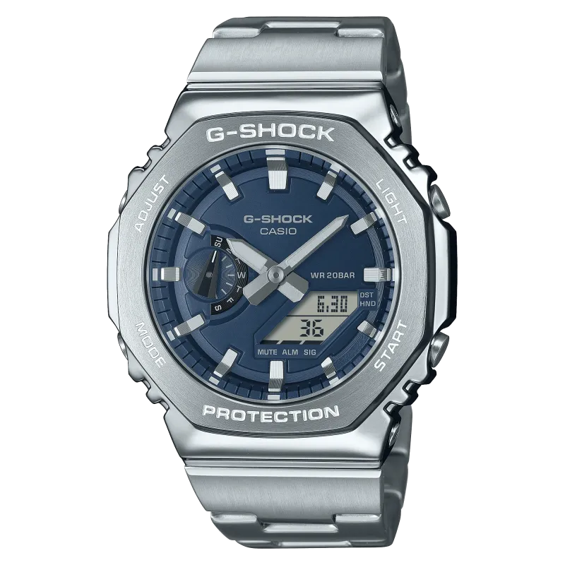 Il G-SHOCK GM-2110D combina il design classico e robusto dei modelli G-SHOCK con un tocco di eleganza grazie alla cassa in acciaio inossidabile e al nuovo bracciale in metallo. Con una cassa sottile di soli 11,8 mm, è uno dei modelli combinati più leggeri e resistenti, ideale sia per le attività quotidiane che per le situazioni più impegnative. Caratteristiche principali: Dimensioni della cassa: 49.3 × 44.4 × 11.8 mm Peso: 146 g Materiale della cassa e della lunetta: Resina rinforzata con fibra di vetro e acciaio inossidabile Cinturino: Cinturino in acciaio inossidabile con chiusura one-touch a 3 pieghe Struttura: Resistente agli urti Impermeabilità: Fino a 20 bar Alimentazione e durata della batteria: Durata approssimativa della batteria di 3 anni con SR726W X 2 Esterno: Vetro minerale Cinturino regolabile: Da 150 a 205 mm Neobrite: Luminescenza sui numeri e lancette Funzioni principali: Ora internazionale: 31 fusi orari (48 città + tempo coordinato universale), con attivazione/disattivazione dell'ora legale. Cronometro: Cronometro a centesimi di secondo con misurazione fino a 59'59''99 per i primi 60 minuti e 1 secondo dopo. Può registrare tempo trascorso, tempi parziali e tempi del 1° e 2° posto. Timer conto alla rovescia: Unità di misura di 1 secondo, intervallo fino a 24 ore, con impostazione dell'ora di inizio conto alla rovescia da 1 secondo a 24 ore. Promemoria sonori: 5 promemoria giornalieri. Luce: Doppia luce LED, per il quadrante e per il display digitale (Super Illuminator), con durata selezionabile dell'illuminazione (1,5 secondi o 3 secondi). Calendario: Calendario automatico completo fino all'anno 2099. Precisione: ±15 secondi al mese. Altre caratteristiche: Funzione di spostamento delle lancette: Le lancette si spostano per non bloccare la visualizzazione del display digitale. Indicazione dell'ora regolare: Analogico: 2 lancette (ora, minuto e secondo, con la lancetta che si muove ogni 20 secondi) e 1 quadrante per il giorno. Digitale: Ora, minuto, secondo, pm, mese, data. Il GM-2110D offre una perfetta combinazione di estetica e funzionalità, rendendolo adatto a chi cerca un orologio G-SHOCK elegante ma resistente, pronto ad affrontare ogni sfida quotidiana.