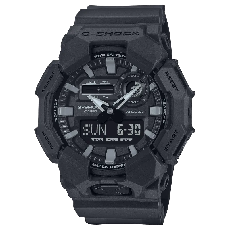 Il G-SHOCK GA-010 è un orologio analogico-digitale che unisce praticità e robustezza in un design audace. Dotato di funzioni essenziali come l’ora mondiale e il cronometro, questo modello è pensato per chi cerca affidabilità in ogni situazione. La cassa in carbonio e resina a base biologica lo rende una scelta ecologica, mentre la batteria con autonomia fino a 10 anni garantisce prestazioni durature. Caratteristiche Principali Struttura Carbon Core Guard per resistenza agli urti senza compromessi Impermeabilità fino a 20 bar, ideale per qualsiasi avventura Luce LED Super Illuminator con pulsante frontale per un accesso immediato Ora mondiale con 31 fusi orari e passaggio rapido tra orario locale e UTC 5 promemoria sonori giornalieri con uno ritardato e segnale orario