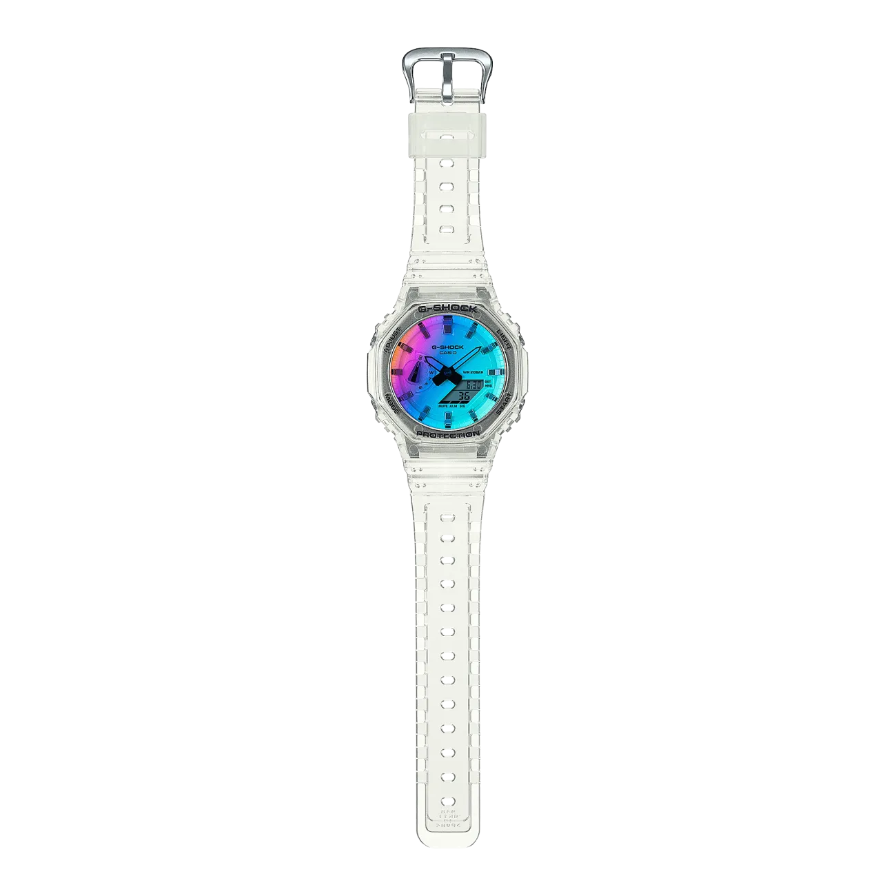 Iridescent Color: serie cangiante ispirata ai tropici, vetro minerale con deposizione a vapore effetto arcobaleno (ogni pezzo è unico); cassa/lunetta in carbonio-resina con struttura Carbon Core Guard, cinturino in resina trasparente; resistente agli urti, impermeabile 20 bar; dimensioni 48.5 × 45.4 × 11.8 mm, peso 51 g; doppia luce LED (Super Illuminator) per quadrante e display, Neobrite, LED bianco; batteria 3 anni (SR726W ×2); funzioni: ora mondiale (31 fusi), cronometro a centesimi, timer 24 h, 5 allarmi giornalieri, segnale orario, calendario automatico 2099, silenziamento tasti, precisione ±15 s/mese, funzione spostamento lancette; indicazione analogico-digitale (2 lancette + giorno; ora/min/SEC, PM, mese, data).