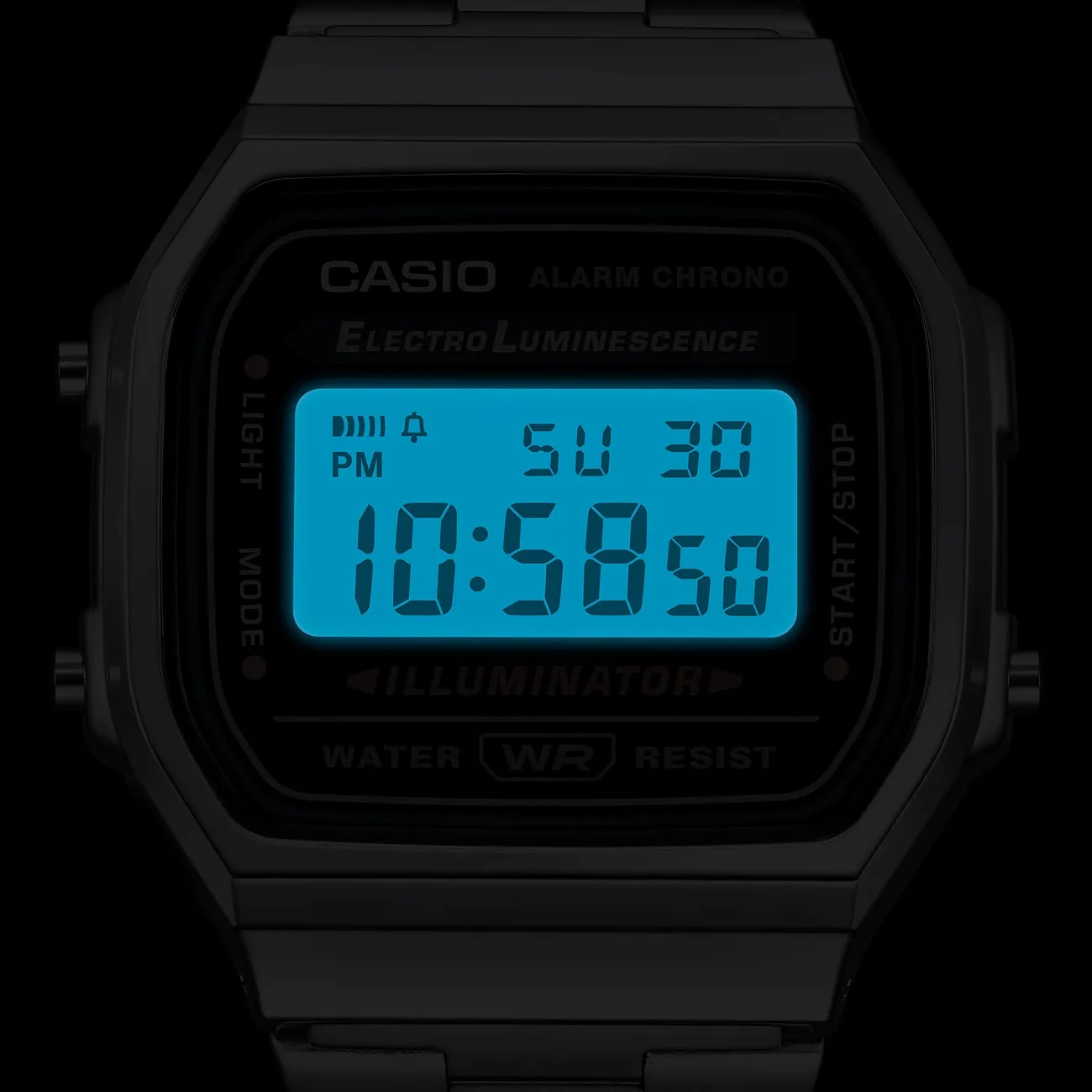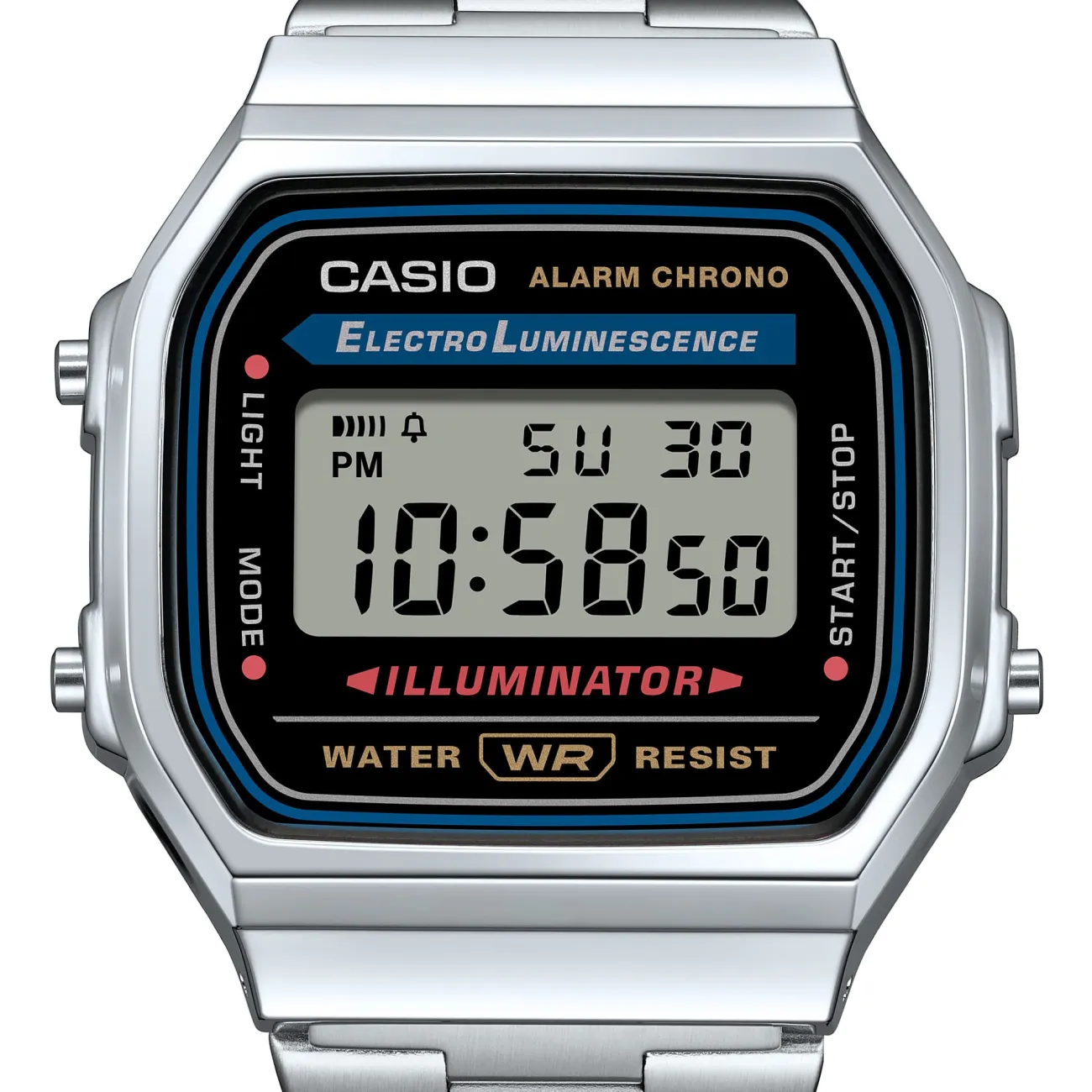Orologio digitale iconico in metallo dal design semplice e facile da abbinare; impermeabile; cinturino in acciaio inox con chiusura regolabile (autoregolabile); cassa 38.6 × 36.3 × 9.6 mm in resina/cromato, vetro in resina, peso 50 g, cinturino regolabile 145–205 mm; batteria CR2016 con durata approssimativa 7 anni; funzioni: cronometro a centesimi (59'59,99" con tempi trascorso/parziale/1° e 2° posto), promemoria sonoro giornaliero, segnale orario, retroilluminazione elettroluminescente (EL blu‑verde), calendario automatico (febbraio 28 giorni), precisione ±30 s/mese; indicazione digitale di ora, minuto, secondo, PM, data, giorno.