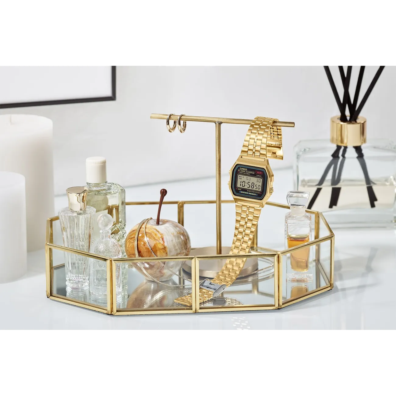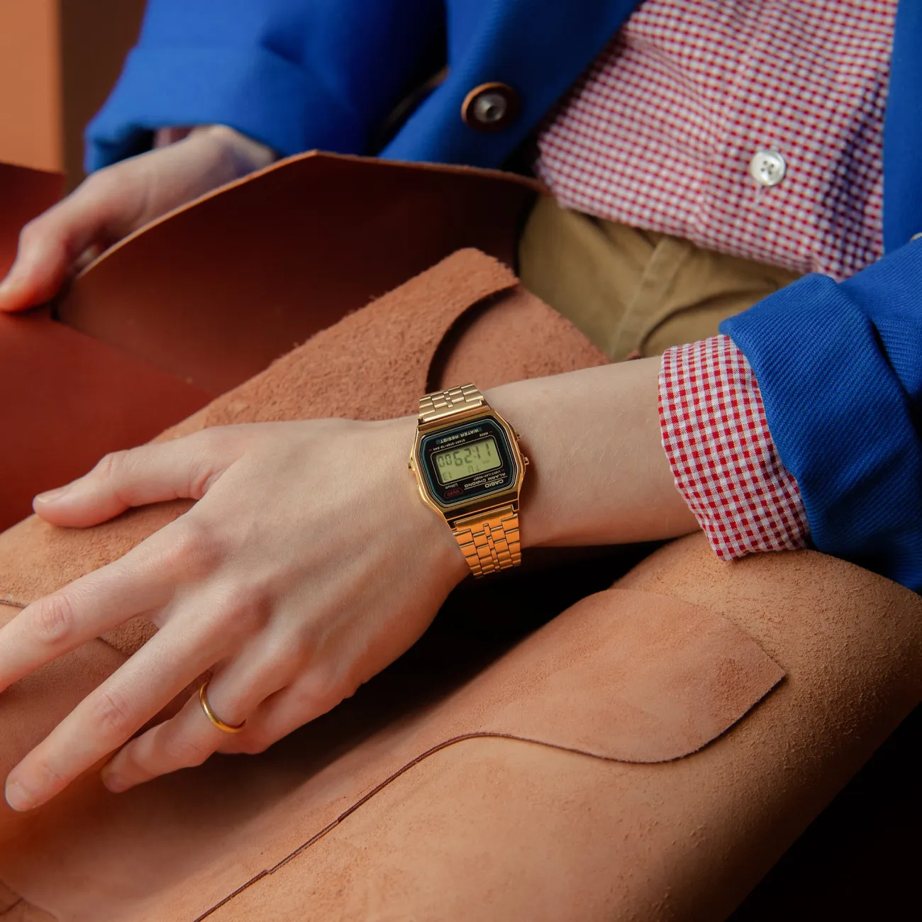 Orologio digitale classico unisex con quadrante squadrato e finitura tonalità oro; cassa in resina, vetro in resina; cinturino in acciaio inossidabile con chiusura regolabile; impermeabile; luce LED verde (visibile al buio); cronometro a centesimi (59'59,99", tempi trascorso/parziale/1° e 2° posto); promemoria sonoro giornaliero e segnale orario; calendario automatico (febbraio impostato a 28 giorni); precisione ±30 s/mese; batteria CR2016 con durata approssimativa 7 anni; dimensioni cassa 36.8 × 33.2 × 8.2 mm; peso 44 g; indicazione digitale: ora, minuto, secondo, PM, data, giorno del mese.