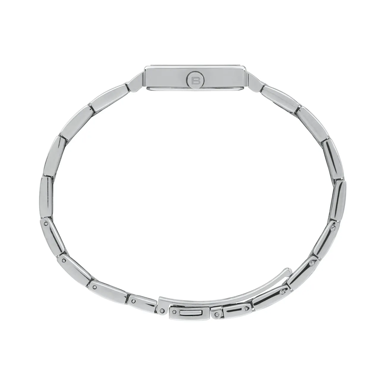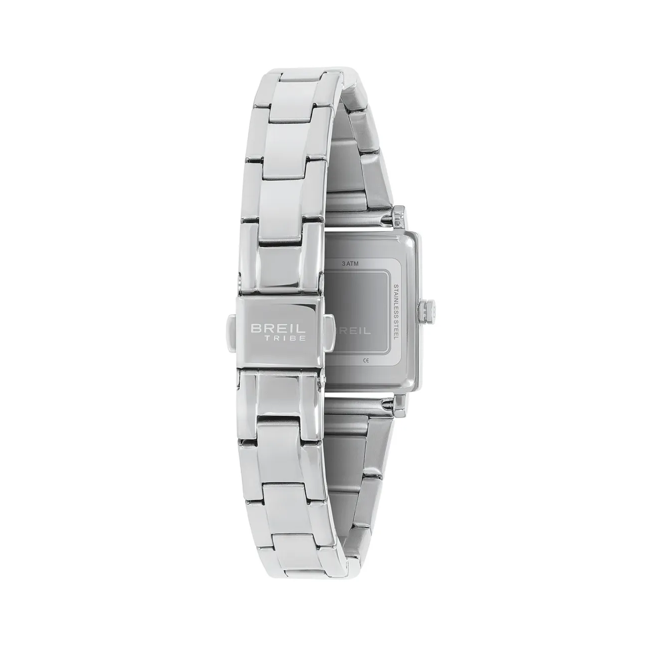 L’orologio da donna Divine si distingue per la sua cassa rettangolare e il quadrante bianco impreziosito da un rehault decorato con cristalli che cattura la luce ad ogni movimento, creando riflessi delicati. Gli indici alternano cristalli luminosi a dettagli silver, regalando un gioco di contrasti sofisticato. A completare il design il bracciale gioiello in acciaio lucido, che avvolge il polso con eleganza.