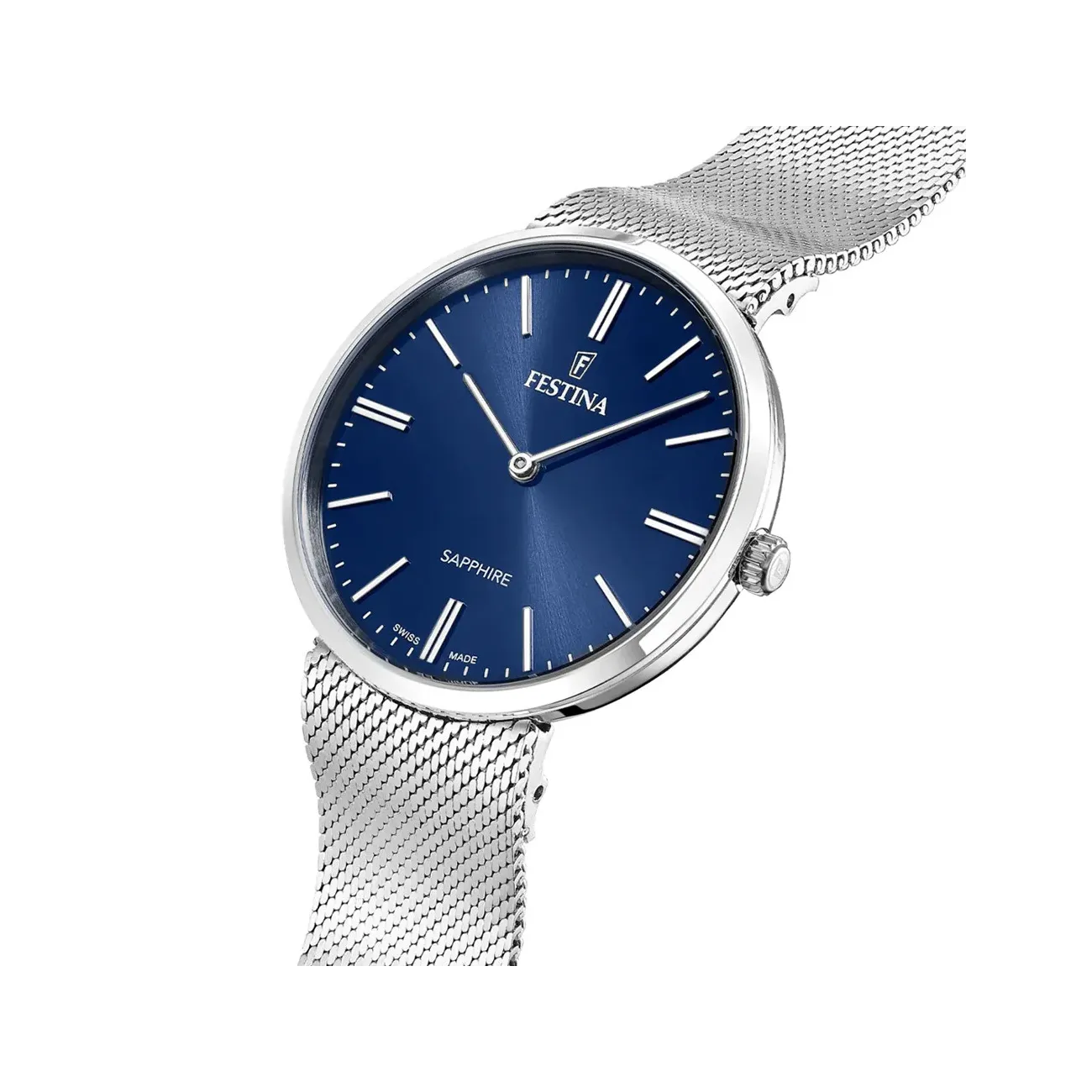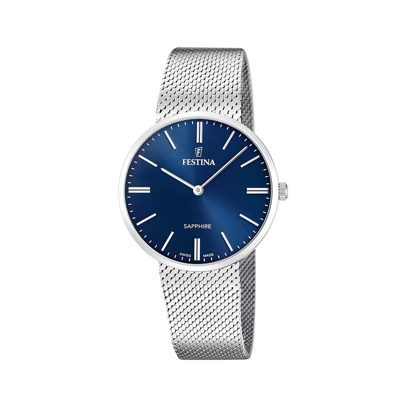 Orologio ore e minuti di Festina da uomo della collezione Grace. Orologio realizzato in acciaio inossidabile 316l con cassa di forma rotonda di misura 39.3 mm e spessore 6,7 mm con vetro zaffiro. Quadrante di colore azzuro con indici di colore grigio. Cinturino realizzato in acciaio inossidabile 316l di colore argento con chiusura a scatto. Funzioni: ore e minuti. Movimento al quarzo analogico. La resistenza all'acqua è 5 ATM. La referenza è F20074/2