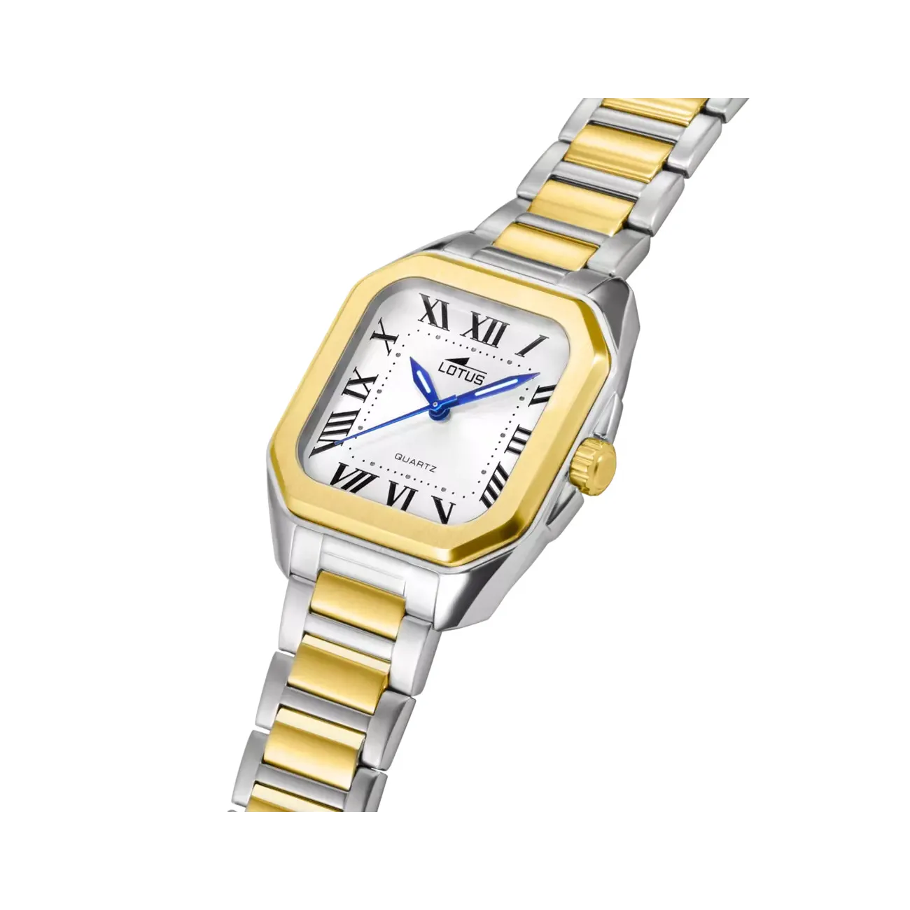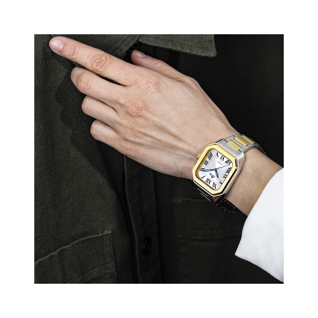 Un orologio della Square Series che combina la luminosità del quadrante bianco con la forza di un bracciale in acciaio bicolore. La cassa quadrata rafforza un design moderno e versatile, ideale per i look quotidiani con un tocco sofisticato.
