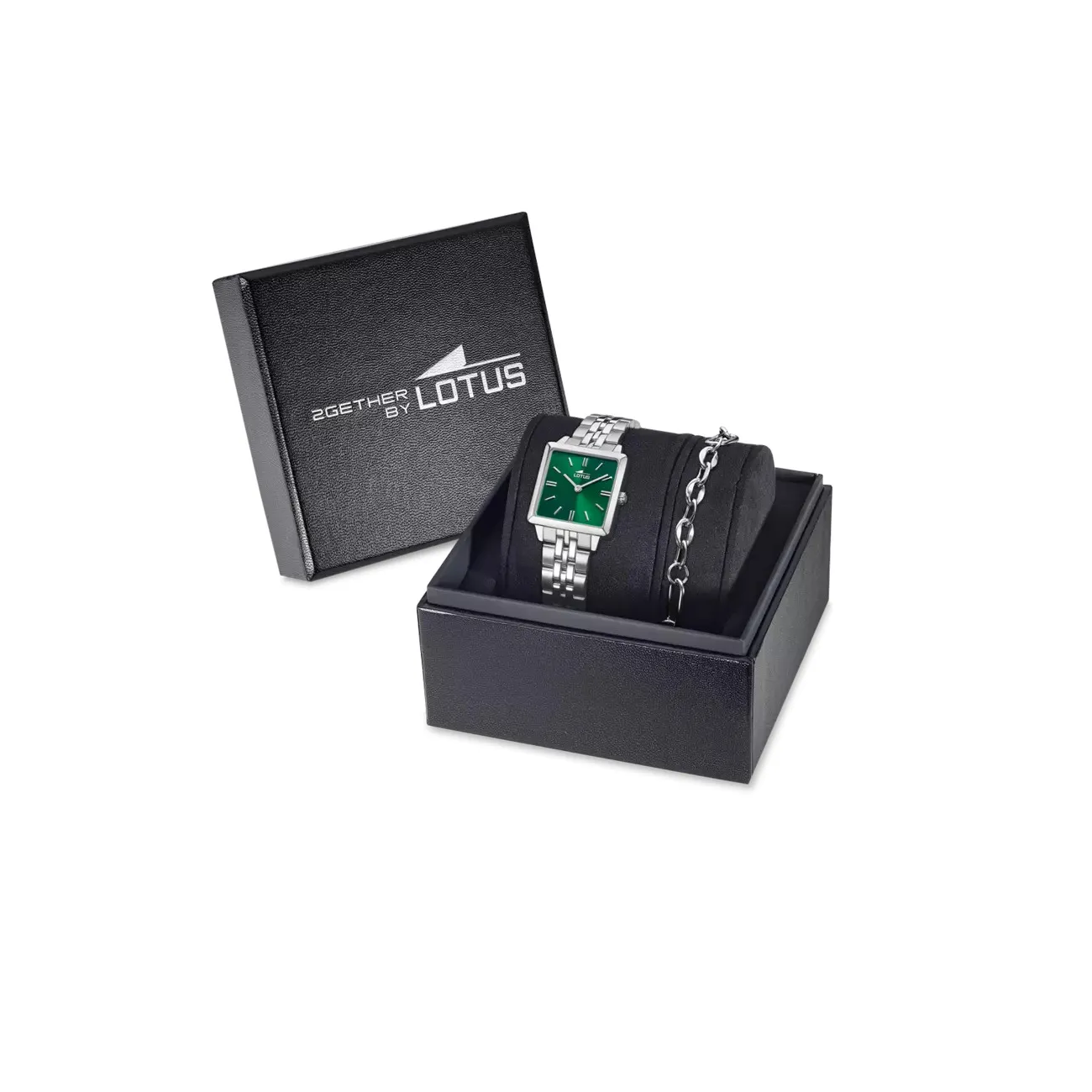 Il Lotus 2Gether 19010/5 affascina con il quadrante verde deciso e la cassa quadrata in acciaio inox – classico, raffinato e distintivo. Proposto in un esclusivo cofanetto con bracciale coordinato, è l’idea regalo ideale per sorprendere con eleganza.