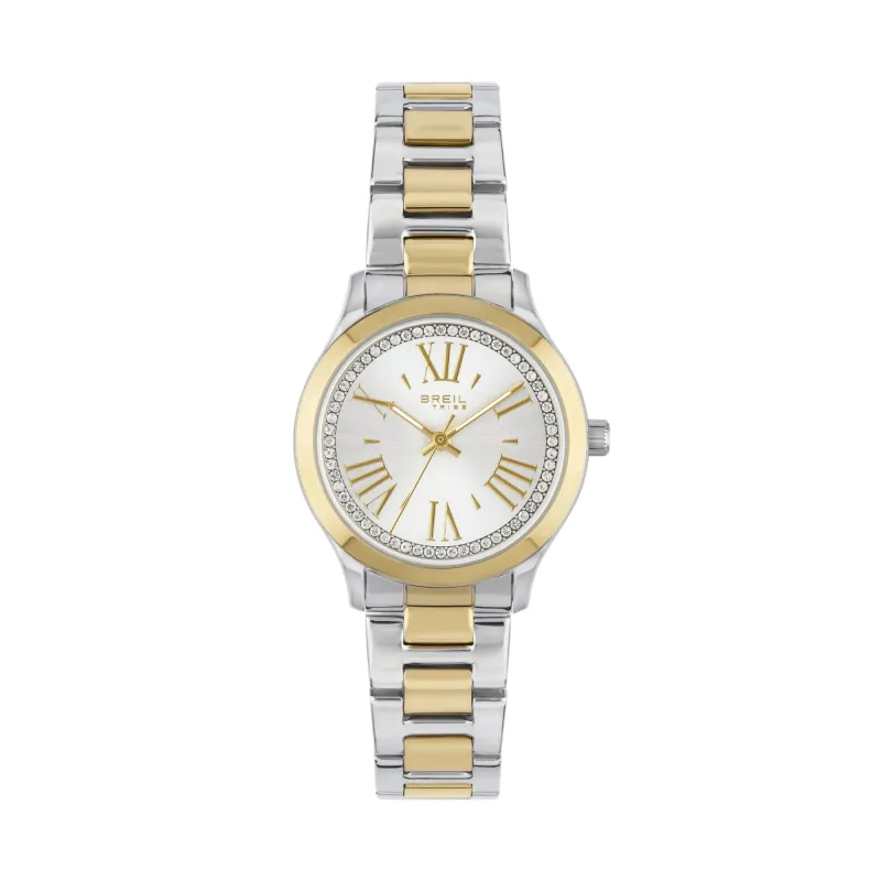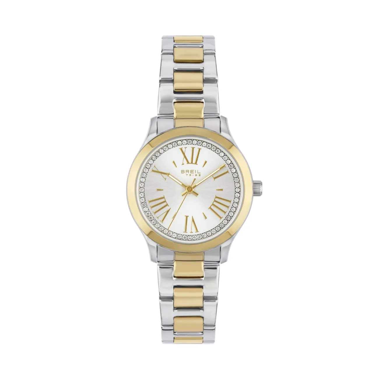 L'orologio solo tempo da donna Abby ha tutte le caratteristiche per diventare un classico senza tempo da indossare in ogni occasione. Bracciale e cassa sono caratterizzati dall'accostamento dell'accio lucido proposto nei due colori silver e oro. Un trattamento bicolor che esalta il quadrante color silver dal fascino retrò, accentuato dagli indici con numeri romani in color oro e reso ancora più prezioso dagli scintillanti cristalli incastonati lungo il rehaut. Charm ed eleganza, con un tocco eccentrico.
