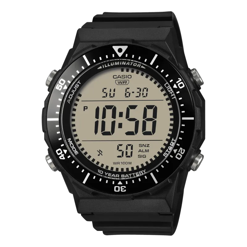Lo sportwatch Casio AE-1700H-1AVEF è un orologio digitale multifunzionale con ampio display di facile lettura e lunetta girevole, pensato per chi pratica sport e ama uno stile dinamico. La robusta cassa in resina e alluminio da 54,9 × 47,3 × 14,3 mm, il cinturino in resina regolabile (145–215 mm) e il peso di 60 g garantiscono comfort e resistenza nell’uso quotidiano. Impermeabile fino a 10 bar, è adatto a nuoto e attività outdoor, mentre il vetro in resina protegge il quadrante dalle sollecitazioni. Tra le funzioni principali offre ora doppia, cronometro a centesimi di secondo fino a 23:59'59,99'', timer conto alla rovescia fino a 24 ore con ripetizione automatica e promemoria fine tempo, oltre a 3 allarmi multifunzione indipendenti e segnale orario per una perfetta organizzazione della giornata. La batteria garantisce fino a 10 anni di autonomia (CR2032), mentre la retroilluminazione LED ambra con durata selezionabile (1,5 o 3 secondi) assicura ottima visibilità al buio.