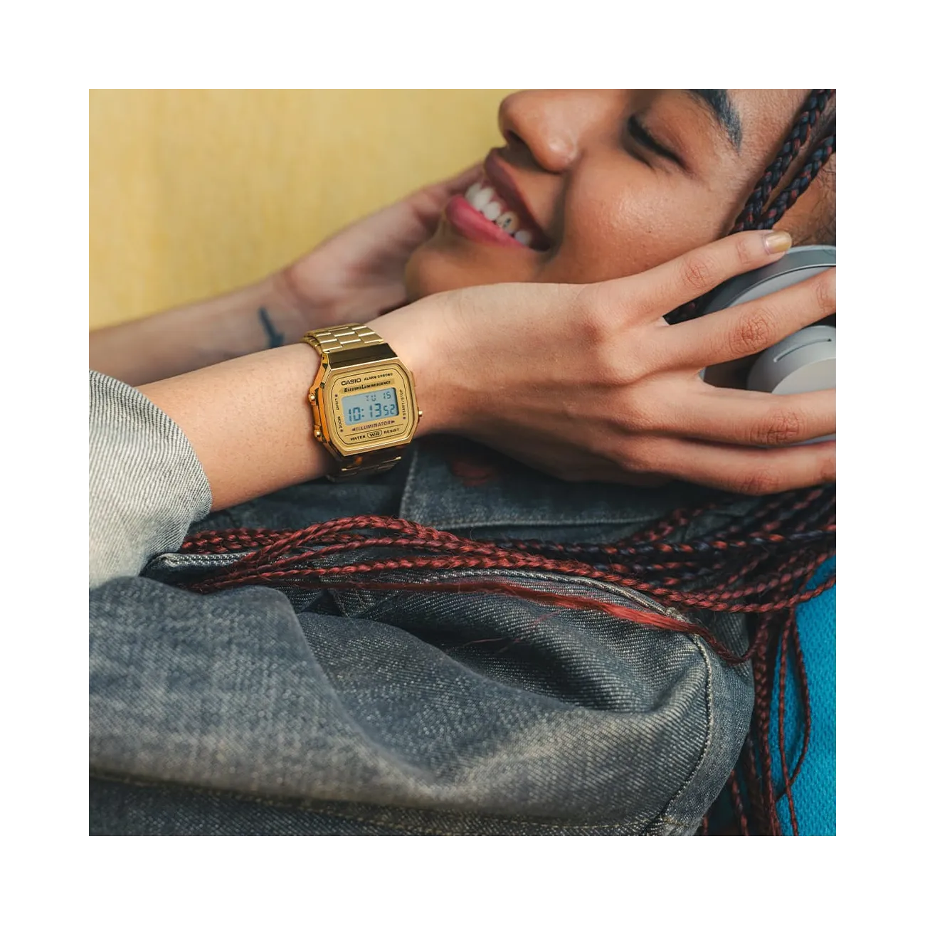 Un’icona dal design originale che richiama lo stile di oltre 40 anni fa, aggiornata con la praticità della tecnologia moderna. La finitura oro retrò trasforma questo orologio digitale in un vero pezzo di storia del design, perfetto per chi ama accessori vintage ma funzionali. Il look è unisex e versatile, ideale sia per outfit casual che per dare un tocco distintivo a uno stile più curato.  Compatto e leggero (49 g), presenta cassa in resina da 38,6 × 36,3 × 9,6 mm e cinturino in acciaio inox con chiusura autoregolabile (145–205 mm) per una vestibilità comoda. È impermeabile per l’uso quotidiano e garantisce fino a 7 anni di autonomia con batteria CR2016. Oltre all’ora, offre calendario, cronometro a centesimi di secondo (fino a 59'59,99'' con tempi parziali e 1°/2° posto), promemoria sonoro giornaliero e segnale orario. La retroilluminazione elettroluminescente blu-verde assicura una buona leggibilità anche al buio, con precisione di ±30 secondi al mese. Un classico intramontabile Casio, perfetto per chi vuole un digitale dorato iconico e sempre attuale.