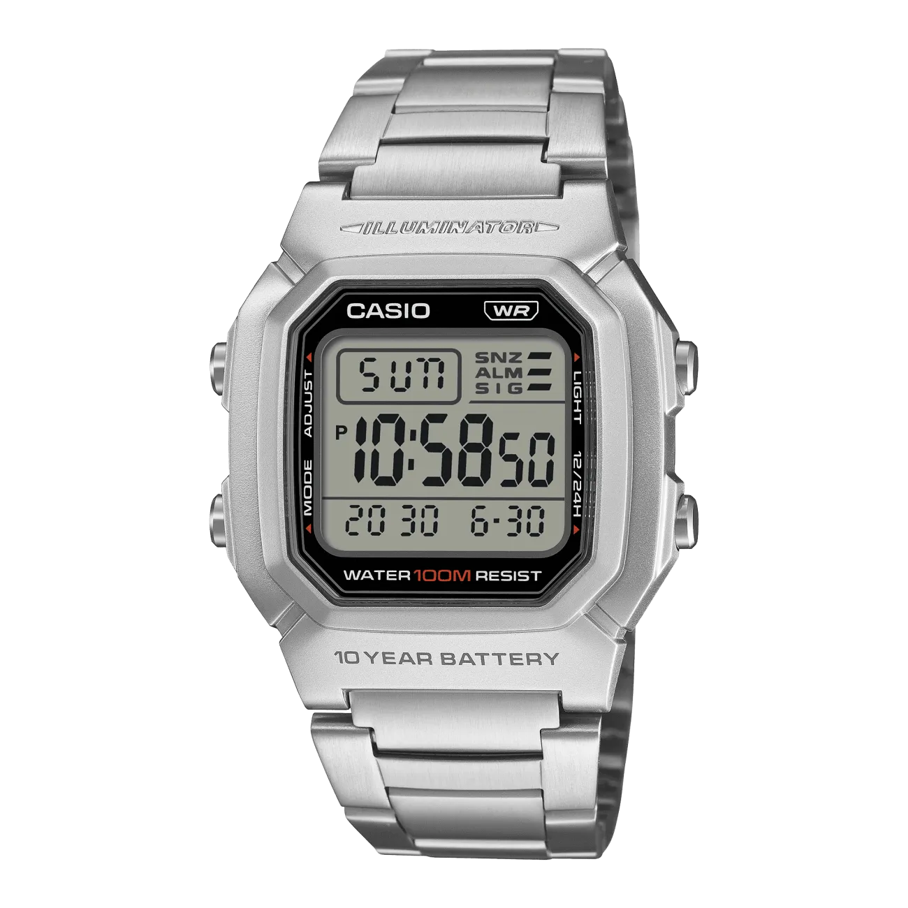 Casio W-800HD-1AVEF è l’orologio digitale della semplicità assoluta: un design essenziale con ampio display per leggere l’ora in modo chiaro e immediato, ideale per chi vuole praticità senza compromessi. La cassa in resina da 44,2 × 36,8 × 13,4 mm è abbinata a un cinturino in acciaio inossidabile con chiusura a tre pieghe, regolabile da 150 a 205 mm, per un look sportivo e pulito adatto a ogni giorno. Progettato per durare, offre batteria fino a 10 anni (CR2025) e impermeabilità fino a 10 bar, perfetta per nuoto e attività outdoor. La retroilluminazione LED verde garantisce visibilità al buio, mentre le funzioni integrate coprono tutto ciò che serve: ora doppia per gestire un secondo fuso orario, cronometro a centesimi di secondo fino a 23:59'59,99'' con tempo parziale, promemoria sonoro multifunzione (con 1 allarme ritardato) e segnale orario. Completa il tutto il calendario automatico completo fino al 2099, formato 12/24 ore e precisione di ±30 secondi al mese.