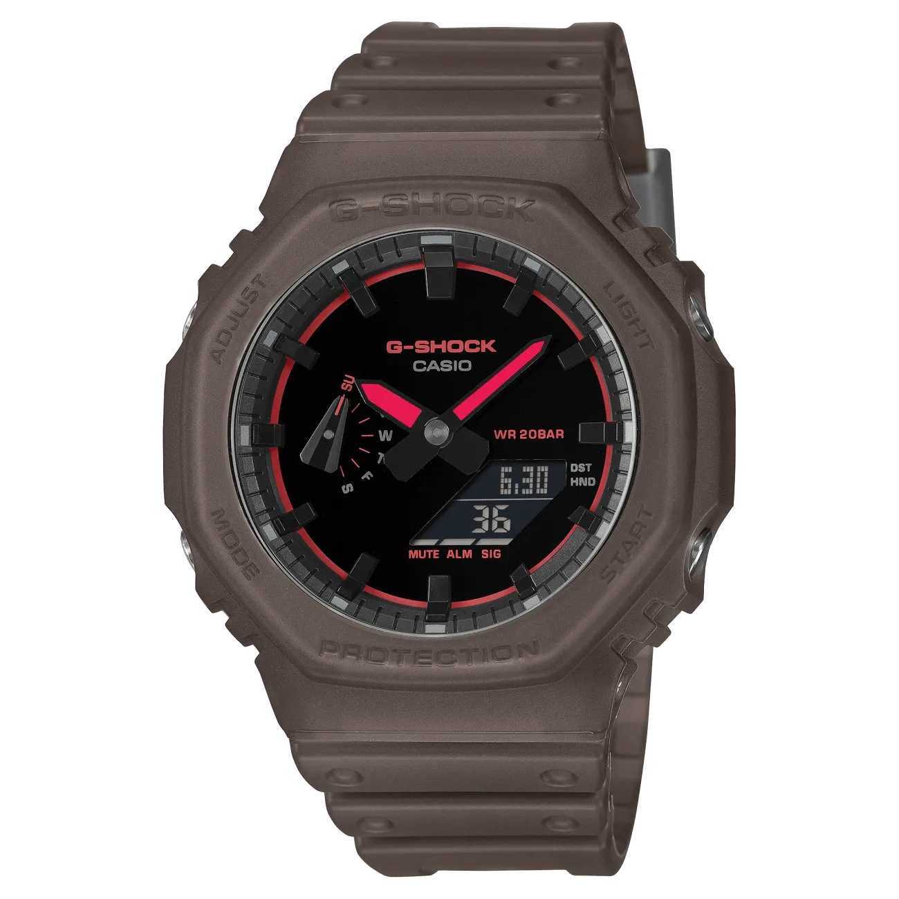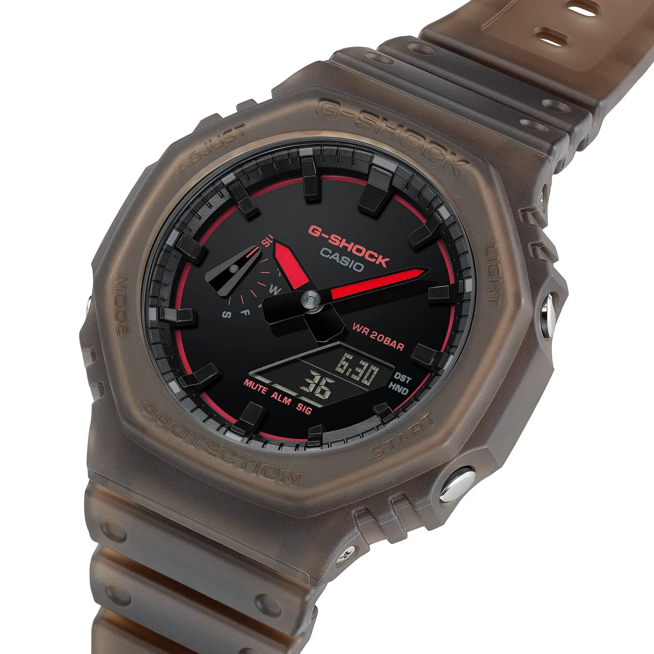 Il G-SHOCK GA-2100K-5AER cattura l’atmosfera dei club e dei festival con un look inedito: quadrante total black dall’effetto quasi liscio e dettagli rosso neon che accendono lancette, scritte e perimetro per un contrasto ultra contemporaneo. La cassa e il cinturino marroni semitrasparenti con finitura opaca richiamano la nebbia delle macchine del fumo, offrendo una texture particolare e una presenza scenica diversa dal solito. È un modello pensato per chi vuole distinguersi con uno stile audace, notturno e di tendenza. Sotto l’estetica c’è tutta la sostanza G-SHOCK: struttura antiurto con Carbon Core Guard, materiali in carbonio/resina e impermeabilità fino a 20 bar per accompagnarti anche nelle giornate più intense. La cassa misura 48,5 × 45,4 × 11,8 mm e pesa 51 g, con cinturino regolabile 145–215 mm e vetro minerale.